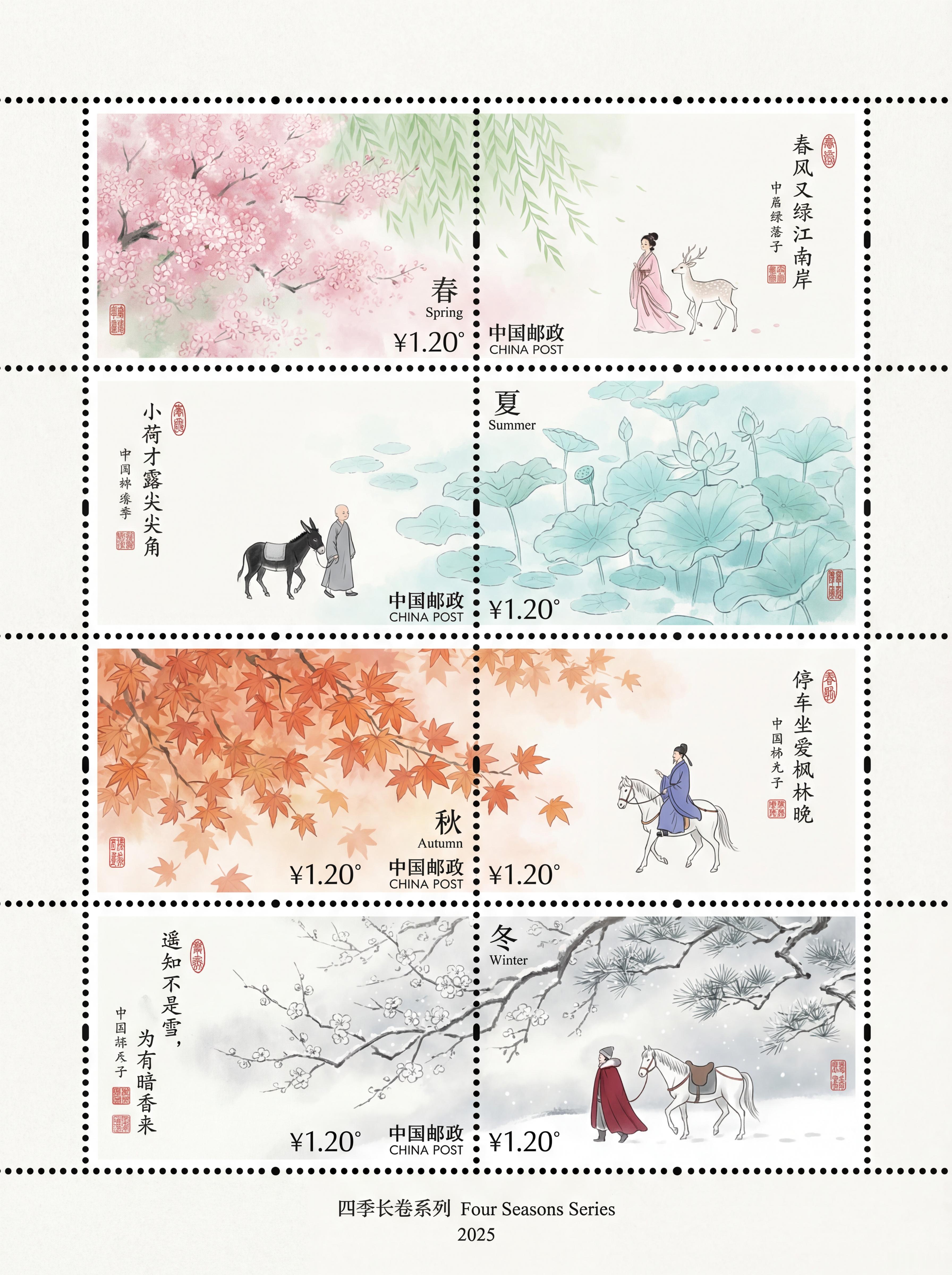 一套很漂亮的邮票提示词,出自推特(x.com/servasyy_ai/status/2004805605937254631):{ "style": "Chinese postage stamp design, Neo-Chinese ink wash painting shuimo style, official commemorative stamp series format", "composition": "A vertical sheet of four connected postage stamps arranged top to bottom: spring - summer - autumn - winter. Each stamp has perforated edges and independent design while maintaining cohesive series aesthetic", "overall_mood": "tranquil serene zen-like dreamy ethereal mood with gentle seasonal feeling, elegant postage stamp refinement, ample negative white space, soft natural transitions between stamps with subtle ink gradients", "artistic_quality": "highly artistic masterpiece quality stamp design, subtle ink gradients, official commemorative series standard", "stamp_format": { "border": "each stamp hasic perforated edges (齿孔边缘) all around", "margins": "clean white margins surrounding the entire stamp sheet", "denomination": "¥1.20 face value printed on each stamp", "issuer": "中国邮政 CHINA POST text at bottom of each stamp", "series_info": "四季长卷系列 Four Seasons Series at sheet bottom", "issue_year": "2025" }, "sections": [ { "season": "spring", "stamp_label": "春 Spring", "foliage": "dense soft pink cherry blossoms and tender light green willow leaves with clear rhythmic textures and veins", "edges": "leaf/petal edges gradually blur and fade creating soft depth layering and ethereal misty atmosphere", "figure": "tiny young lady in pale pink flowing hanfu walking beside a white deer", "rendering": "figures and animal simply outlined with minimal delicate ink lines, no unnecessary details", "color": "fresh elegant pale pink and light green color scheme dominant", "poem": "short elegant ancient Chinese poem inscription (4-7 characters or brief couplet) in delicate calligraphy matching spring theme placed tastefully within stamp", "seal": "poetic small vermilion red seal stamp (zhuwen red seal) with elegant ancient Chinese poetic phrase in corner", "stamp_text": "denomination ¥1.20, 中国邮政 CHINA POST at bottom, 春 Spring label" }, { "season": "summer", "stamp_label": "夏 Summer", "foliage": "dense pale cyan and light green lotus leaves and pads with clear rhythmic textures and veins", "edges": "leaf edges gradually blur and fade creating soft depth layering and ethereal misty atmosphere", "figure": "tiny monk in simple gray long robe walking beside a black donkey", "rendering": "figures and animal simply outlined with minimal delicate ink lines, no unnecessary details", "color": "fresh elegant pale cyan and light green color scheme dominant", "poem": "short elegant ancient Chinese poem inscription (4-7 characters or brief couplet) in delicate calligraphy matching summer theme placed tastefully within stamp", "seal": "poetic small vermilion red seal stamp (zhuwen red seal) with elegant ancient Chinese poetic phrase in corner", "stamp_text": "denomination ¥1.20, 中国邮政 CHINA POST at bottom, 夏 Summer label" }, { "season": "autumn", "stamp_label": "秋 Autumn", "foliage": "dense warm orange-red and amber maple leaves with clear rhythmic textures and veins", "edges": "leaf edges gradually blur and fade creating soft depth layering and ethereal misty atmosphere", "figure": "tiny scholar in flowing indigo hanfu robe riding a white horse", "rendering": "figures and animal simply outlined with minimal delicate ink lines, no unnecessary details", "color": "elegant warm pale orange and soft gold color scheme dominant", "poem": "short elegant ancient Chinese poem inscription (4-7 characters or brief couplet) in delicate calligraphy matching autumn theme placed tastefully within stamp", "seal": "poetic small vermilion red seal stamp (zhuwen red seal) with elegant ancient Chinese poetic phrase in corner", "stamp_text": "denomination ¥1.20, 中国邮政 CHINA POST at bottom, 秋 Autumn label" }, { "season": "winter", "stamp_label": "冬 Winter", "foliage": "dense pale gray-white plum blossoms branches and sparse dark green pine needles lightly dusted with snow, clear rhythmic textures", "edges": "edges gradually blur and fade creating soft depth layering and ethereal misty atmosphere", "figure": "tiny traveler in deep crimson cloak leading a white horse", "rendering": "figures and animal simply outlined with minimal delicate ink lines, no unnecessary details", "color": "cool elegant pale silver-gray and soft crimson color scheme dominant", "poem": "short elegant ancient Chinese poem inscription (4-7 characters or brief couplet) in delicate calligraphy matching winter theme placed tastefully within stamp", "seal": "poetic small vermilion red seal stamp (zhuwen red seal) with elegant ancient Chinese poetic phrase in corner", "stamp_text": "denomination ¥1.20, 中国邮政 CHINA POST at bottom, 冬 Winter label" } ], "global_elements": { "sheet_bottom": "series title '四季长卷系列 Four Seasons Series', issue year '2025'", "stamp_sheet_format": "four stamps connected vertically with perforated edges between each, clean white margins around entire sheet", "parameters": "--ar 3:4 --stylize 400 --v 6" }, "negative_prompt": "photorealistic, 3d render, cartoon, chibi, overly detailed face, big figures, crowded composition, heavy saturated colors, harsh thick outlines, text artifacts, watermark, signature too large, modern elements, western style, oil painting, acrylic, thick brush strokes, low contrast, busy background, sharp focus, people dominant, realistic proportions, extra animals, colorful flowers, bright lighting, harsh shadows, no perforations, modern stamp design, photo stamps, digital art style, overlapping stamps, torn edges, damaged stamps, incorrect denomination, wrong issuer name, missing borders, frameless design"}