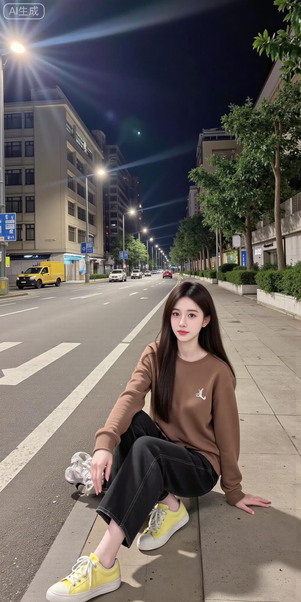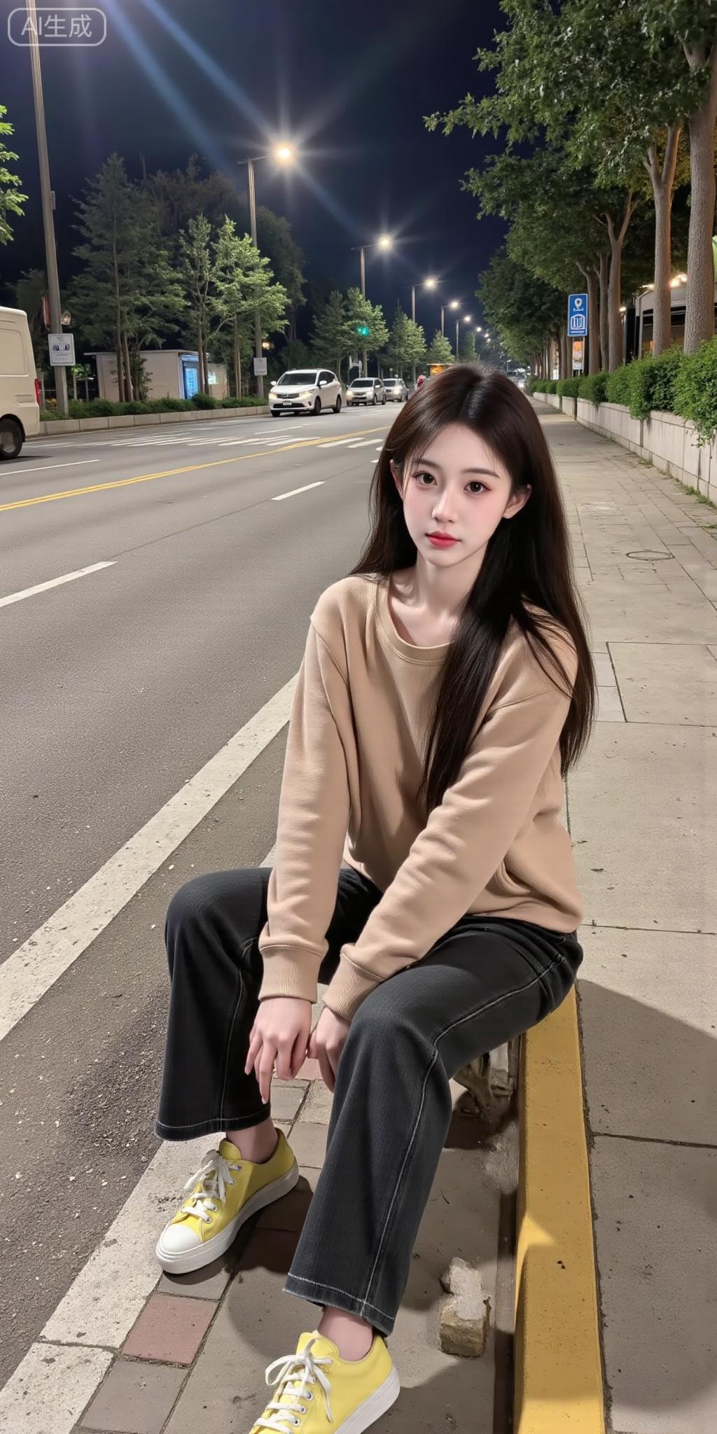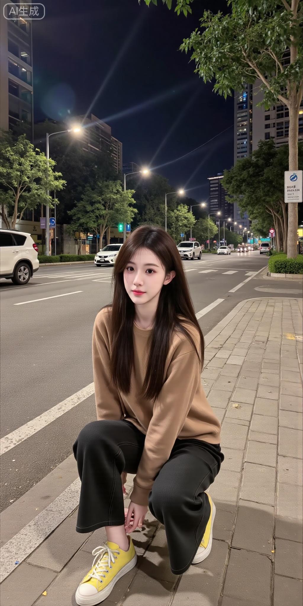 夜街蹲拍,暖棕+亮黄是心动的休闲甜系浅棕系穿搭照 粉棕穿搭