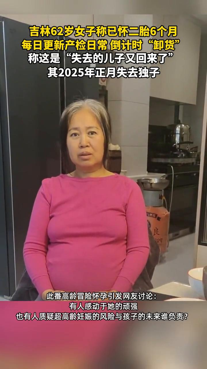 吉林62岁女子称已怀二胎6个月,每日更新产检日常倒计时"印货",称这是"失去的儿子又回来了",其2025年正月失去独子。 近日,吉林。一名62岁女子公开宣布已怀二胎6个月,每天在社交平台更新产检日常、倒计时"卸货"。据其账号主页介绍,她2025年正月失去独子。 此番高龄冒险怀孕引发网友讨论:有人感动于她的顽强,也有人质疑超高龄妊娠的风险与孩子的未来谁负责?针对"超高龄产妇",医生表示:超高龄生育风险极高,妊娠期并发症、麻醉、产后出血等致命风险会成倍增加。确有生育需求者,务必先做全面医学评估,孕期全程遵医嘱监护,选择具备多学科急救能力的医院,以最大程度保障母婴安全。