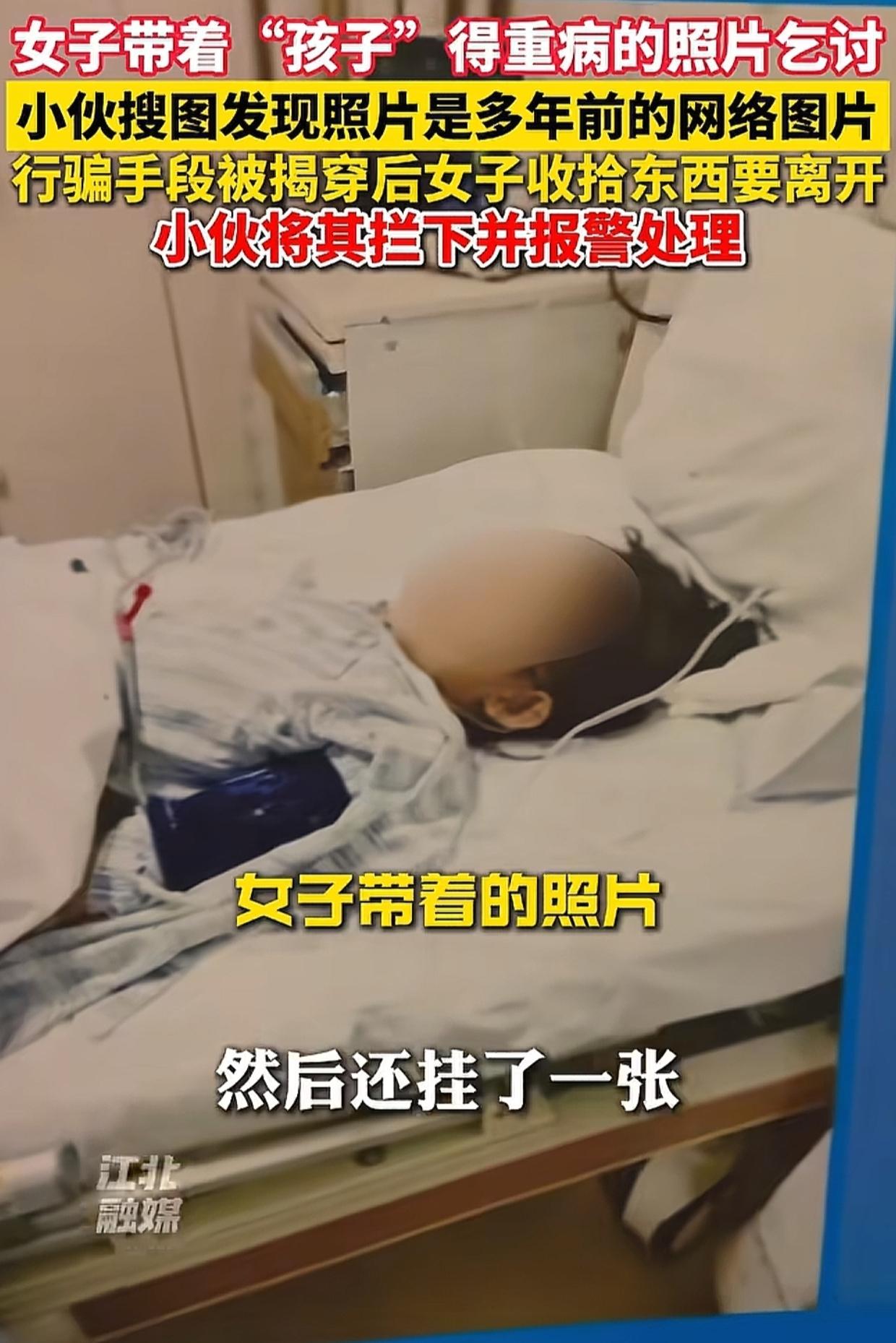 河南,小伙儿在街头见一30多岁的女子跪地乞讨,身边的牌子上写着,女儿得了脑肿瘤需要大家捐钱。 不到5分钟,周围就有不少人慷慨解囊,旁边还有好心的摊主送来免费的食物。 小伙儿见到牌子上病重孩子的图片,心生怜悯也想掏钱,忽然觉得女子红光满面,不像是经历生活苦难的人。 于是小伙儿掏出手机,用以图搜图功能核实图片的真假,这才发现这居然是一张多年前的网图。 小伙儿很气愤,当场戳穿女子说,你为什么拿着网上生病小孩的图片来骗,说一下,为什么利用别人的孩子骗钱? 女子一听惊慌失措,急忙站起身,收拾好东西拉着皮箱就要逃跑,可是正义的小伙儿在后面紧追不舍。 女子尝试打出租车或者坐公交离开,全部被小伙儿拦截下来。最后小伙儿选择报警,女子被带走接受调查。 看到这件事情,感觉首先应该谴责行骗的女子,她把别人的苦难当做骗钱的工具,消耗大众的善良,使真正需要帮助的人难以获得支持,这不但严重违背了社会公德,也触碰了法律的红线。 其次应该称赞小伙儿,在行善时理性核实信息,让骗子没有得逞,并报警让骗子去接受调查。 不得不说,小伙儿的行为是社会责任感的体现,也是对善良最负责的守护。 大家对这件事情怎么看?