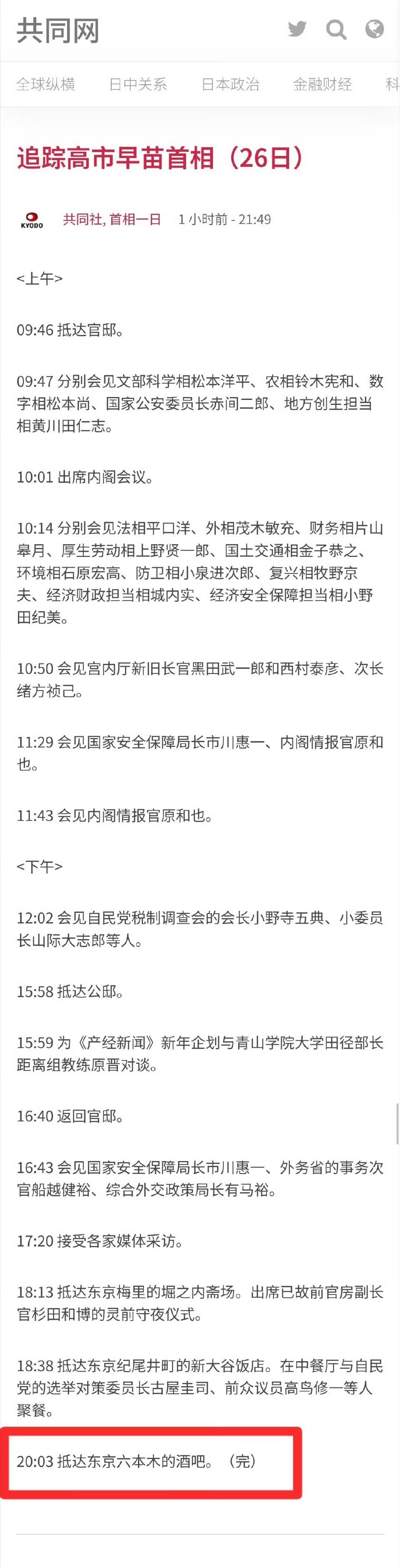 12月26日,高市早苗没有去参拜晋国神社……但晚上20:03去了酒吧,不知道是不