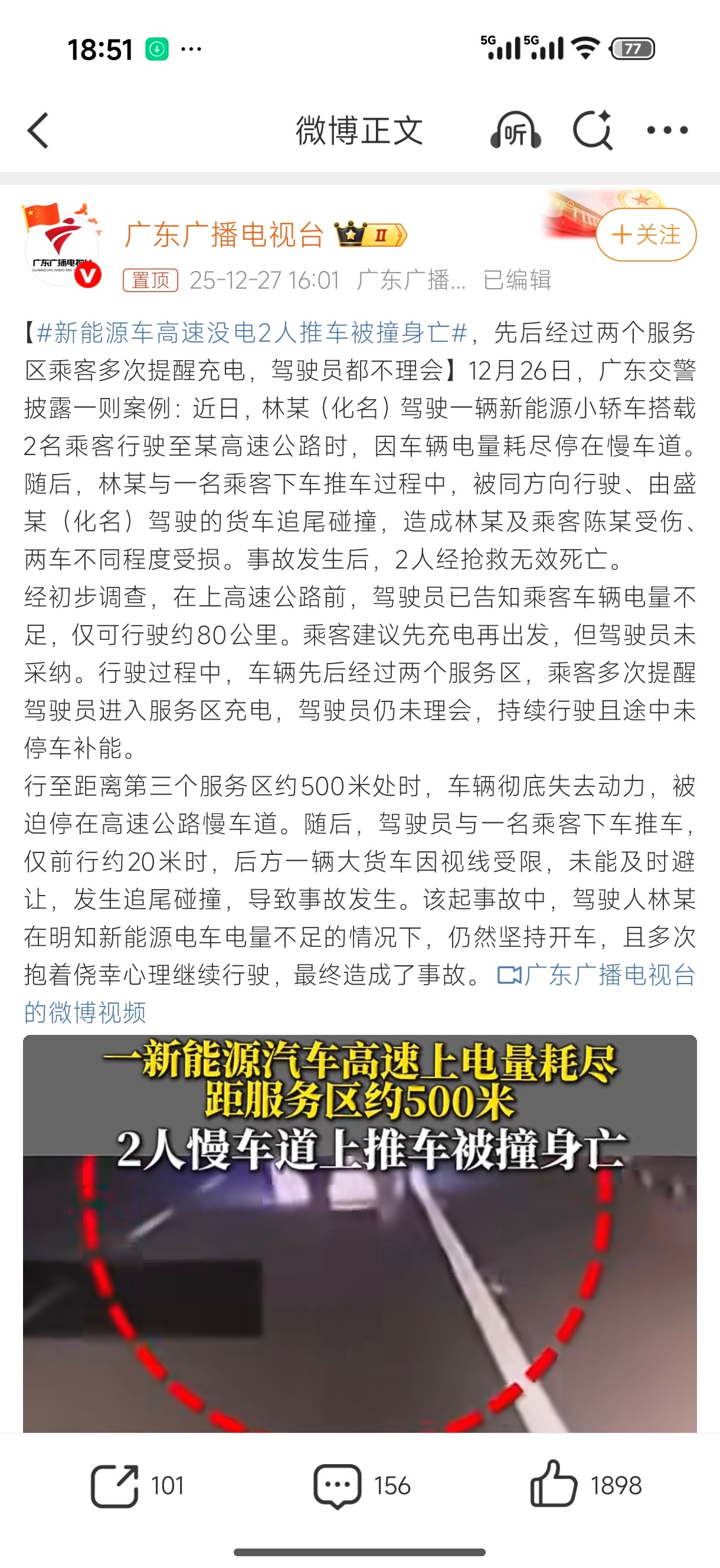 新能源车高速没电2人推车被撞身亡怎么能有这么离谱的司机,每一个操作都是错的,少电不充电上高速是错的,没电不去服务区是错的,彻底没电还停在行车道上是错的,在行车道上推车更是错的,这司机到底有没有脑子啊!大v聊车