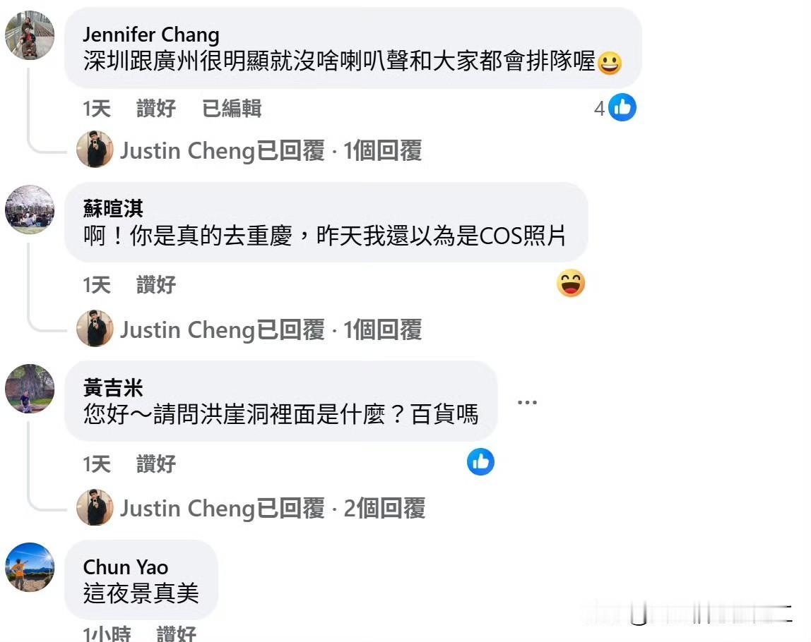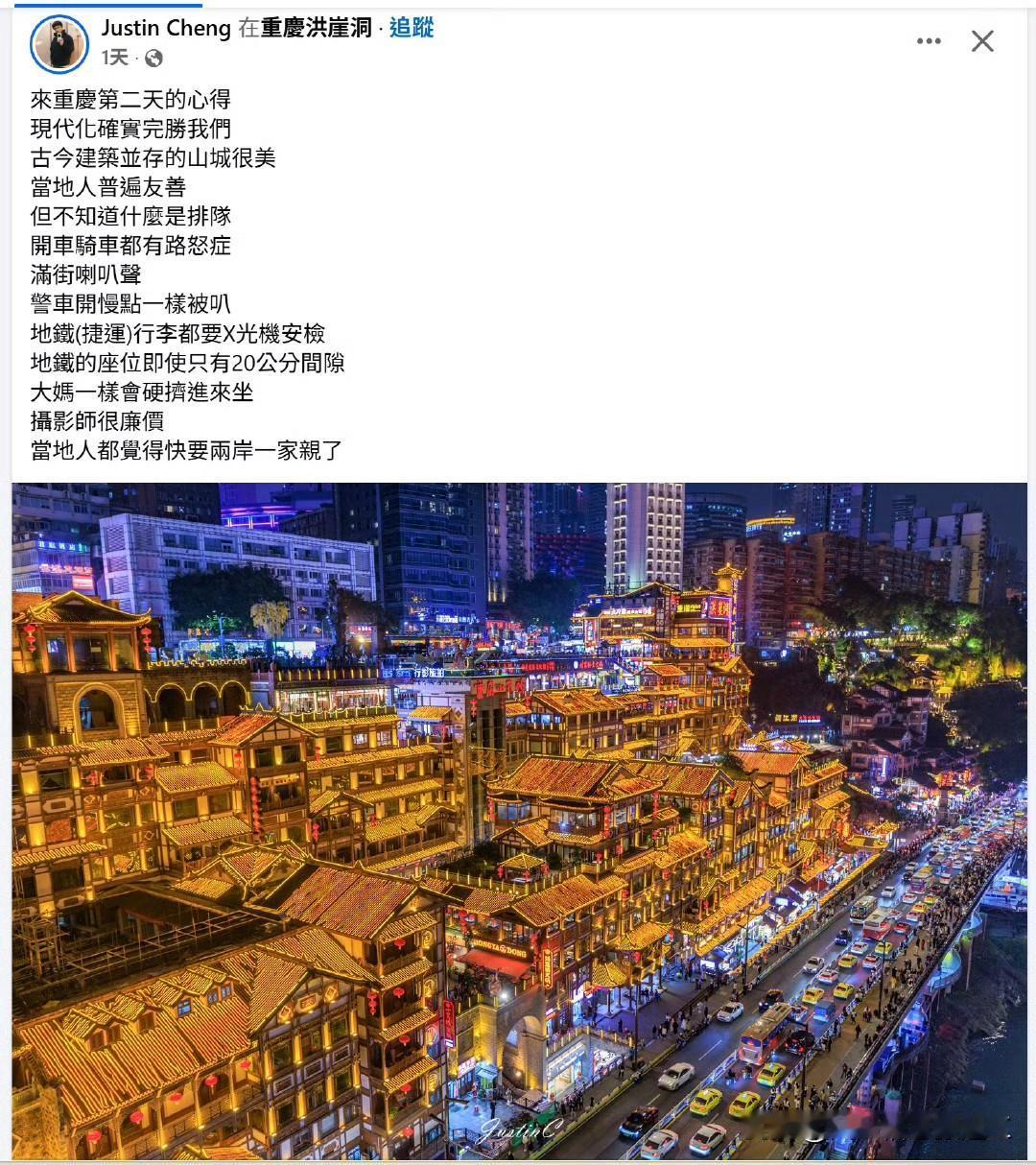 台湾省网友发帖 来重庆第二天的心得 现代化确实完胜我们 古今建筑并存的山城很美 当地人普遍友善 但不知道什么是排队 开车骑车都有路怒症 满街喇叭声 警车开慢点一样被叭 地铁(捷运)行李都要X光机安检 地铁的座位即使只有20公分间隙 大妈一样会硬挤进来坐 摄影师很廉价 当地人都觉得快要两岸一家亲了