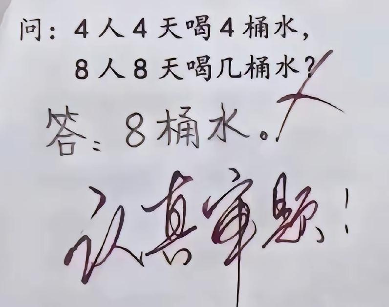 题目:4人4天喝4桶水,8人8天喝几桶水?错误答案是8桶水,正确答案是16桶水。 法一:1人4天喝1桶水,1人8天喝2桶水,8人8天喝16桶水。 法二:4人1天喝1桶水,8人1天喝2桶水,8人8天喝16桶水。