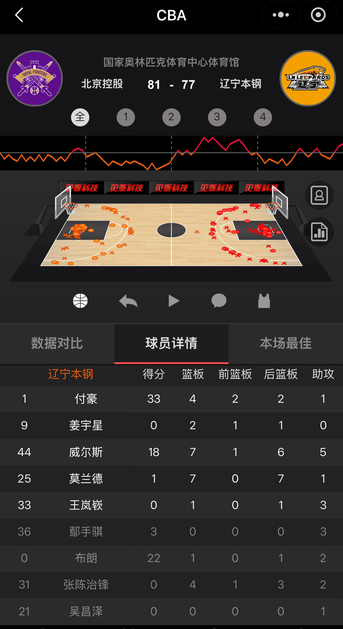 辽宁队客场不敌北控全场比赛下来辽宁队仅有5名球员得分其中3名球员得分上双付豪33分,布朗22分,威尔斯18分,鄢手骐3分,莫兰德1分其他球员均没有得分辽宁男篮辽宁男篮vs北控男篮