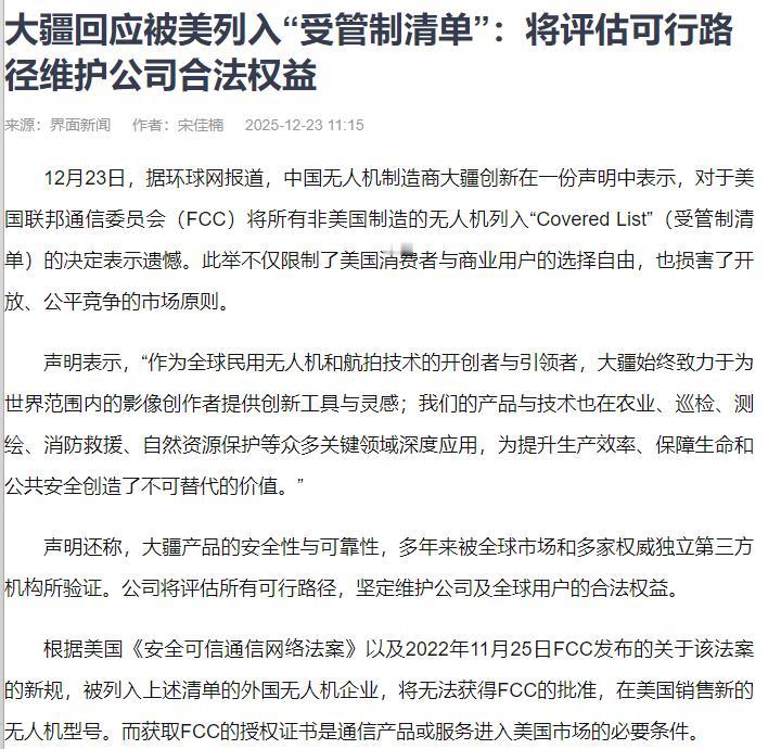 这反转来得也太快了!中美贸易休战刚一个半月,特朗普就憋不住了,直接重拾制裁大棒,可没想到中方早留好了后手。 才刚说了歇口气,美国这边就又开始折腾了,中美之间的贸易关系,好不容易在11月旧金山的那场元首会面后稍微缓了口气,结果还不到两个月,特朗普政府的动作就来了个急转弯。 这次动手的对象,不是别的,又是中国高科技企业,还是熟面孔——大疆这种做无人机的一线厂商。 12月22日,美国联邦通信委员会突然宣布了一项新规定,说以后所有在外国生产的无人机系统和它们的关键部件,都要进一个“受控名单”。 这话听起来挺绕,其实意思很简单:只要不是美国本土造的,无论新机型还是关键部件,想拿到准入资格,那基本就别想了,这不就是直接堵门,不让你进来嘛。 而这事最让人意外的是,它来得实在太快了,11月中旬,特朗普那边还在对外释放“缓和”的信号,结果转眼就搬出了这么一项政策。 这种前后反差,确实让人有点跟不上节奏,看上去像是一次“政策回马枪”,实则是早就在筹划的一套组合拳之一。 别看这次只是FCC发的公告,它背后牵扯的可不是一个简单的部门决定,这其实是美国对华科技封锁战略的延续和升级。 过去几年,美国的打压手段大多集中在关税、投资限制等方面,现在开始往技术认证、市场准入这些更细致也更隐蔽的环节动手了,目标就是要把中国企业从源头上挡在门外。 而且这次的政策措辞也发生了变化,以往美国的做法,是挑具体的公司“点名批评”,这回则是直接按照“产地+产品类型”来划线。 说白了,不管你是哪个品牌、技术多先进、有没有具体问题,只要是中国造的,就统一归入限制范围,这种一刀切的做法,把商业规则和技术标准都当成了政治工具,这还怎么讲理? 从操作层面看,美国并没有一下子把门关死,它规定的是,“以前批准的产品还是可以继续用”,但以后想上新,那就没门。 这其实是留了一点“表面弹性”,但实质上是给中国企业设下了一个“天花板”——你现在的东西能用,但别指望再往上走,这是一种“温水煮青蛙”式的封锁,看起来没那么狠,实则步步为营。 与此同时,美国国会那边也没闲着,国防授权法案刚刚完成立法,里面也加了不少跟中国有关的条款,从投资限制到设备采购,再到企业清单的交叉联动,几乎每一项都在对中国企业“量身定做”。 这不是临时起意,而是一个带有系统性的长期策略,简单说,就是要从资金、技术、市场三个方向,把中国企业的国际通道慢慢卡死。 表面上,美国打着“国家安全”的旗号,说是担心无人机带来潜在风险,但无人机就是个飞在天上的工具,它用来拍摄、测绘、救援,这些事儿全球都在干。 你要说存在风险,那是不是手机、电脑、网络设备也都有风险?而且美国自己有那么多部门在用中国的无人机,这倒好,一边用着一边禁,怎么看怎么别扭。 更现实的是,美国本土的无人机制造能力,短时间内根本接不上茬,中国这些企业不是靠“低价”拿市场的,而是靠技术、靠产品成熟度。 你今天说禁就禁,那以后谁来提供这些产品?市场不是说换就能换的,特别是这种技术密集型的行业,很多美国机构其实心里也清楚这一点,只不过在政策面前,他们也只能被动接受。 不过,中国这边也不是毫无准备,过去几年,从芯片到通信设备,中国企业已经吃过不少苦,也学了不少教训,现在再遇到类似的封锁,反应也更迅速了。 这次大疆虽然没有大张旗鼓反击,但从它的公开立场来看,已经做好了在全球其他市场“另起炉灶”的准备,不靠美国,也能活得挺好。 而且,中国企业现在也越来越重视“规则意识”,以前很多企业在国际市场上吃亏,是因为不熟悉当地法律体系,现在不同了,不少企业开始主动学习合规流程,建立自己的法律团队,碰到不公正待遇,就通过正规渠道提起诉讼,这种做法虽然慢,但更稳,靠的是规则,而不是情绪。 更重要的是,中国并没有被美国的这一套打乱节奏,该造的还在造,该卖的还在卖,同时,国内也在加紧推动技术自主化,核心零部件、关键系统、软件算法这些都在一步步往前赶。 从这次事件看得出来,美国并不打算在技术层面给中国留什么余地,贸易战打完打科技战,科技战打完就开始打认证战,一环扣一环,目的就是拖慢中国在高科技领域的前进速度。 可问题是,这种封锁打压并不能从根本上解决美国自身的技术瓶颈,而且,美国现在这种做法,很容易在全球范围内引起反感,因为它不再是靠市场竞争赢得话语权,而是用行政手段强行排除竞争者。 这种“掀桌子”的行为,在短期内可能有效,但长期看,损害的是自己在国际市场上的信誉,连盟友都可能开始犹豫:今天是中国的无人机,明天会不会轮到我们自己的产品? 这次大疆事件,只是整个中美科技较量中的一个缩影,后面还会有更多类似的动作出来,但从目前的态势看,中国企业的抗压能力正在增强,政府层面也在加强政策引导和国际协调。