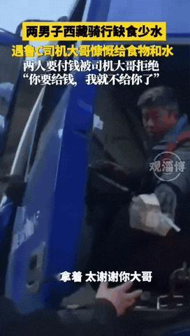 格局打开了!西藏,俩男子在西藏骑行途中,半路水和食物都用完了。不料,刚好遇到一个开大货车的山东大哥,毫不犹豫的拿出水和食物分给俩男子。结果,俩男子刚要给大哥扫码付款,大哥接下来的一句:“你要给钱,我就不给你了!”把格局打开了! 俩男子是骑行爱好者,在穿越西藏途中,由于没有找到落脚的地方,俩人就在路边对付了一宿。 当天也是把仅剩的食物和水都用光了,此时,恰巧一个开鲁C的大货车大哥路过,俩男子询问前面是否有卖吃的。 山东大哥这才知道这俩人一点水和食物都没有了,立马从副驾驶拿出食物和水分给俩男子,俩人见状大哥给的也挺多的,就想给大哥钱。 大哥的一句:“你要给我钱,我就不给你了!”让这哥俩连忙说:“谢谢,我这辈子都不会忘记的这位山东的大哥的!” 有网友评论,你要给钱我就不给你了,这是山东人的格局 俗话说“人在难时一口,胜似富时一斗”山东人的豪爽,到哪里都不缺席。互帮互助是我们的传承的美德。 “你要给钱,我就不给你了!”多么朴实的一句话,充满了中国人性的大爱无疆。 让我们为这个鲁C03A8的大哥点赞吧!