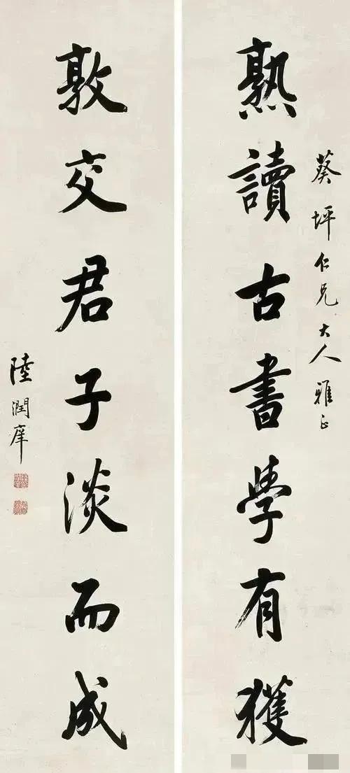 淡交熟读,方得修身真味 陆润庠此联“熟读古书学有获,敦交君子淡而成”,寥寥十二字,道尽修身养性的不二法门,笔墨间的端稳雍容,更将这份处世智慧凝于笔端。 “熟读古书学有获”,恰合“旧书不厌百回读,熟读深思子自知”的古训。古人云“书中自有颜如玉,书中自有黄金屋”,并非指功利之得,而是在与先贤对话中,悟透世事、涵养学识,如孔子“韦编三绝”,终成儒家宗师,这是读书的真义——非为博闻,而为悟道。 “敦交君子淡而成”,则应了“君子之交淡若水,小人之交甘若醴”的箴言。管鲍之交的淡泊相知,伯牙子期的惺惺相惜,皆因心气相投而非利禄相交。淡交不是疏远,是“海内存知己,天涯若比邻”的默契,是历经岁月仍能“久而敬之”的真诚。 笔墨的清隽沉稳,与联文的通透哲思相融,道尽:读书以养智,交贤以修德,淡而久的相处,深而悟的读书,方是修身的终极境界。