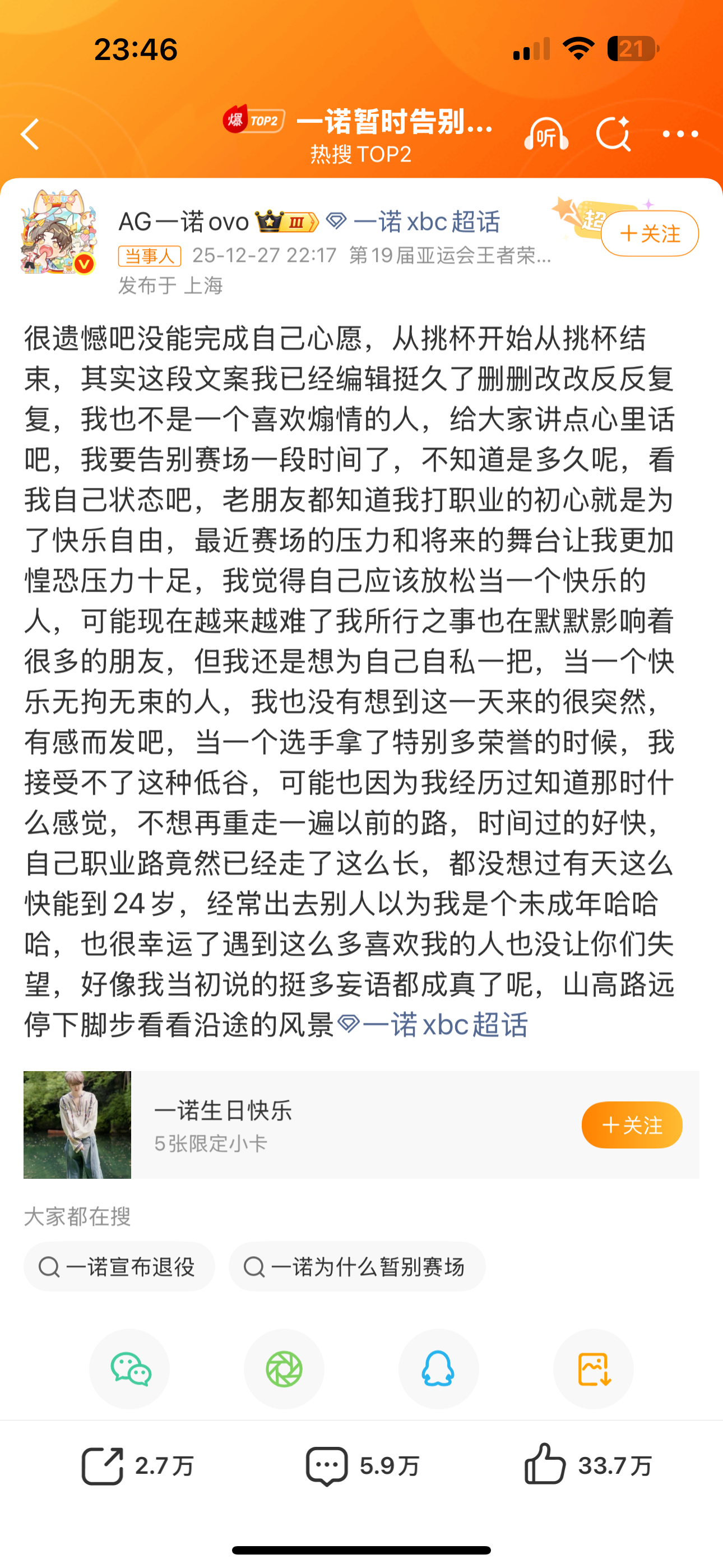 一诺暂时告别赛场 心里咯噔一下…但老粉都懂,你从来都是为快乐在打比赛啊!压力太大就退一步吧,呼吸够了再回来!无论多久都等你,最重要的是你开心!一诺