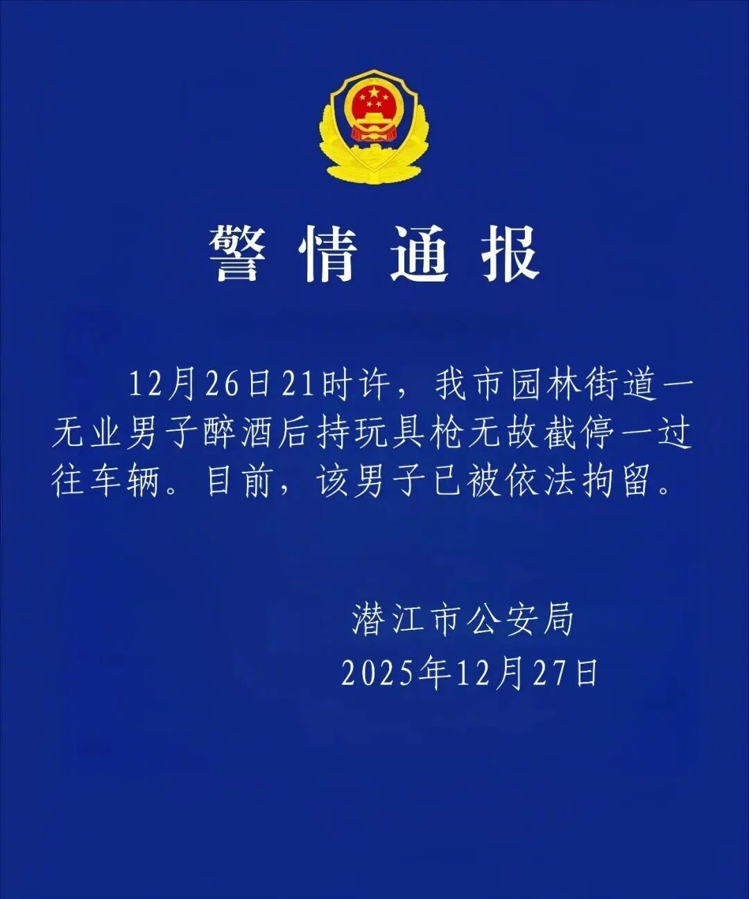 【#警方通报男子醉酒后持玩具枪拦车#】有媒体报道称,湖北潜江一男子近日手持枪状物品,在斑马线上与一辆白色越野车对峙。视频显示,该黑衣男子手持枪状物对着白色越野车的驾驶室,后拉开了白色越野车的门。12月27日晚上,潜江市公安局发布警情通报称,26日21时许,该市园林街道一无业男子醉酒后持玩具枪无故截停一过往车辆。目前,该男子已被依法拘留。