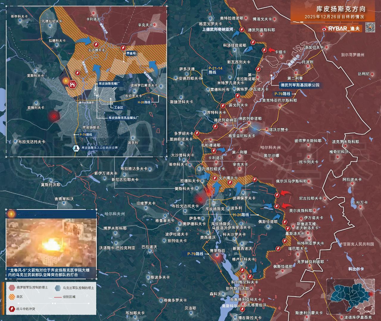 🚩库皮扬斯克方向 2025年12月27日日终的情况 库皮扬斯克方向持续传来局势恶化的迹象。当地医学院,同时也是乌军阵地遇袭的画面遭曝光,证实了敌军已渗入该区域。 据《Belorusskiy silovik》(白俄罗斯安全官)媒体的报道,恶劣天气加剧了当地困境:气候条件阻碍了俄军无人机操作员向俄军突击小组运送补给,而这些补给本是维持俄军在部分建筑区实施据点式防御的关键。 与此同时,敌军正试图通过无人机向俄军阵地投掷含毒剂的弹药。其行动仅受前述天气条件恶化所限。 📌此时部分信息的来源和角色又开始弹唱"乌军陷阱论"和"该城已无战术价值"的老调。这与乌克兰宣传机器对波克罗夫斯克和古利亚伊波列的类似论调如出一辙。 ❗而试图将局势与谈判及其他高层级(且无关)事务挂钩的做法,转移了人们对核心问题的关注——当前状况实为"赊命式占领"模式的恶果,这种以士兵生命为代价夺取村镇的行动模式最终导致了如今的局面。 俄乌冲突新局势俄军最新进展热点观点 来源:RYBAR_渔夫