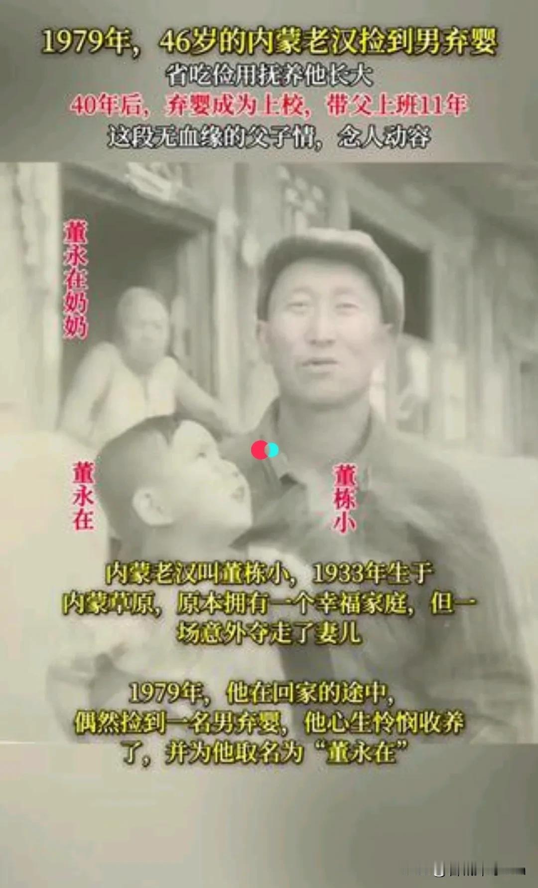 1979年,内蒙古一男子惨遭巨变:2个儿子相继去世,妻子另嫁他人。万念俱灰下,董栋只想随儿子而去,却在地里捡到一个奄奄一息的弃婴。没想到,40年后,弃婴的举动让他老泪纵横。 彼时董栋已46岁,半生辛劳却落得家破人亡,怀里婴儿微弱的啼哭像根针,扎醒了他麻木的心。孩子才两个月大,连哭声都透着虚弱,他没多想就把孩子抱回了家。 老母亲看着家徒四壁的屋子犯愁,劝他送出去,他却红着眼摇头,卖掉家里唯一的老母猪换了钱,请奶妈照顾孩子整整8个月。他给孩子取名董永在,盼着这个新生命能永远留在自己身边。 旁人都劝他,自己糊口都难,何苦养个不相干的孩子。董栋不辩解,只是更拼命地干活。白天在地里种庄稼,晚上去牧场剪羊毛、挤羊奶,老板管饭就把菜偷偷打包带回,自己啃干馒头。 永在渐渐长大,到了上学的年纪,他咬牙送孩子去学堂,反复念叨读书才能改命。家里拿不出住宿费,永在就每天步行6公里往返学校,雨天套着化肥袋挡雨,冬天裹着旧羊皮袄赶路,晚上借着煤油灯学到深夜。 董栋心疼儿子,便多打几份零工,扛货、盖房,什么苦活都干。年过花甲的他终究扛不住,累倒在工地上。永在得知后立刻请假回家,清晨熬药、白天种地、中午做饭、晚上学习,硬生生扛起了家。 他把父亲塞的钱偷偷放回枕头下,带着化肥袋里的干馒头回学校,饿了就啃两口,实在没吃的就喝水充饥。校领导得知情况,免了他的学费和伙食费,这份善意让他更加刻苦,高中三年蝉联三好学生,还拿到了保送名额。 为减轻家里负担,永在选择了免学费的内蒙古师范大学。大学四年,他没要家里一分钱,扛水泥、做家教、发传单,把攒下的钱大部分寄回给父亲。 毕业后,他拒绝企业邀请,主动参军入伍,从基层排长做起,凭借吃苦精神很快得到认可。他深知理论重要,利用空闲时间备考,先后考上硕士、国防大学博士,后来成为武警指挥学院教员,2011年晋升为上校。 工作稳定后,永在第一时间把董栋接到天津同住。他每天早起陪父亲锻炼,晚上下厨做饭,周末带老人逛公园、看大海。2019年,永在调任北京军事科学院,频繁出差让他放心不下年迈的父亲。 思前想后,他向上级申请带父上班,哽咽着说起父亲当年的收留之恩,“没有他,我早就在襁褓中夭折,现在他老了,我不能不管”。领导被打动,当即批准了这个特殊请求。 董栋起初不肯,怕耽误儿子工作,劝着要去养老院。永在抱住他的胳膊,眼泪掉下来:“爹,你当年盼我永远在身边,现在该我守着你了。” 从此,北京的军事科学院里多了道温暖的风景,永在每天推着轮椅带父亲上班,工作间隙就去看看老人,下班陪他聊天散步。董栋坐在办公室里,看着儿子忙碌的身影,偶尔和同事闲聊,脸上总挂着满足的笑。 40年光阴流转,当年奄奄一息的弃婴长成了国家栋梁,曾经绝望的老农被儿子捧在手心。没有血缘的羁绊,却有着超越亲情的坚守,董栋用一生付出换来了永在的感恩相守。这份情谊证明,真正的亲情从不在血缘里,而在日复一日的付出与牵挂中。 各位读者你们怎么看?欢迎在评论区讨论。