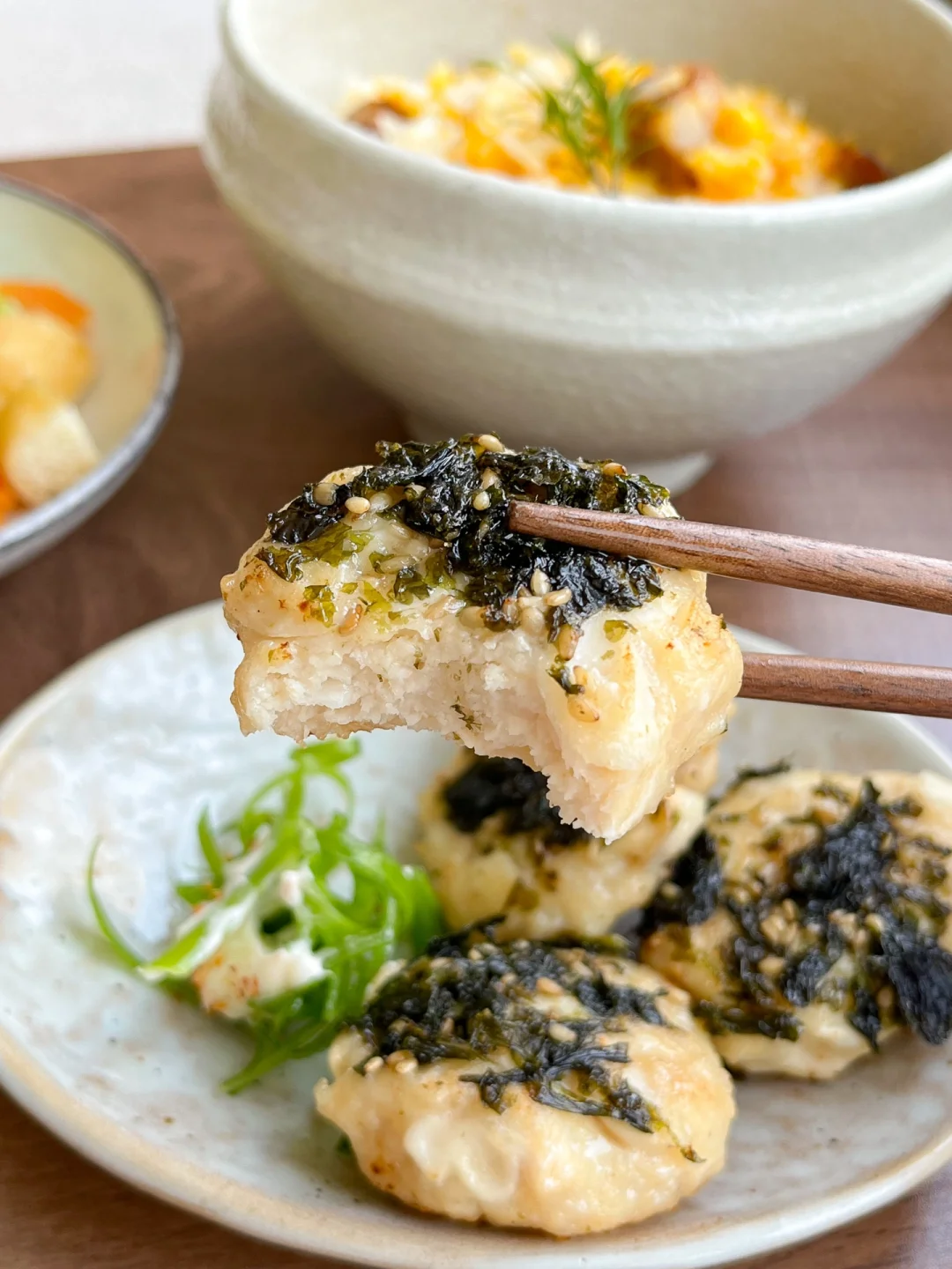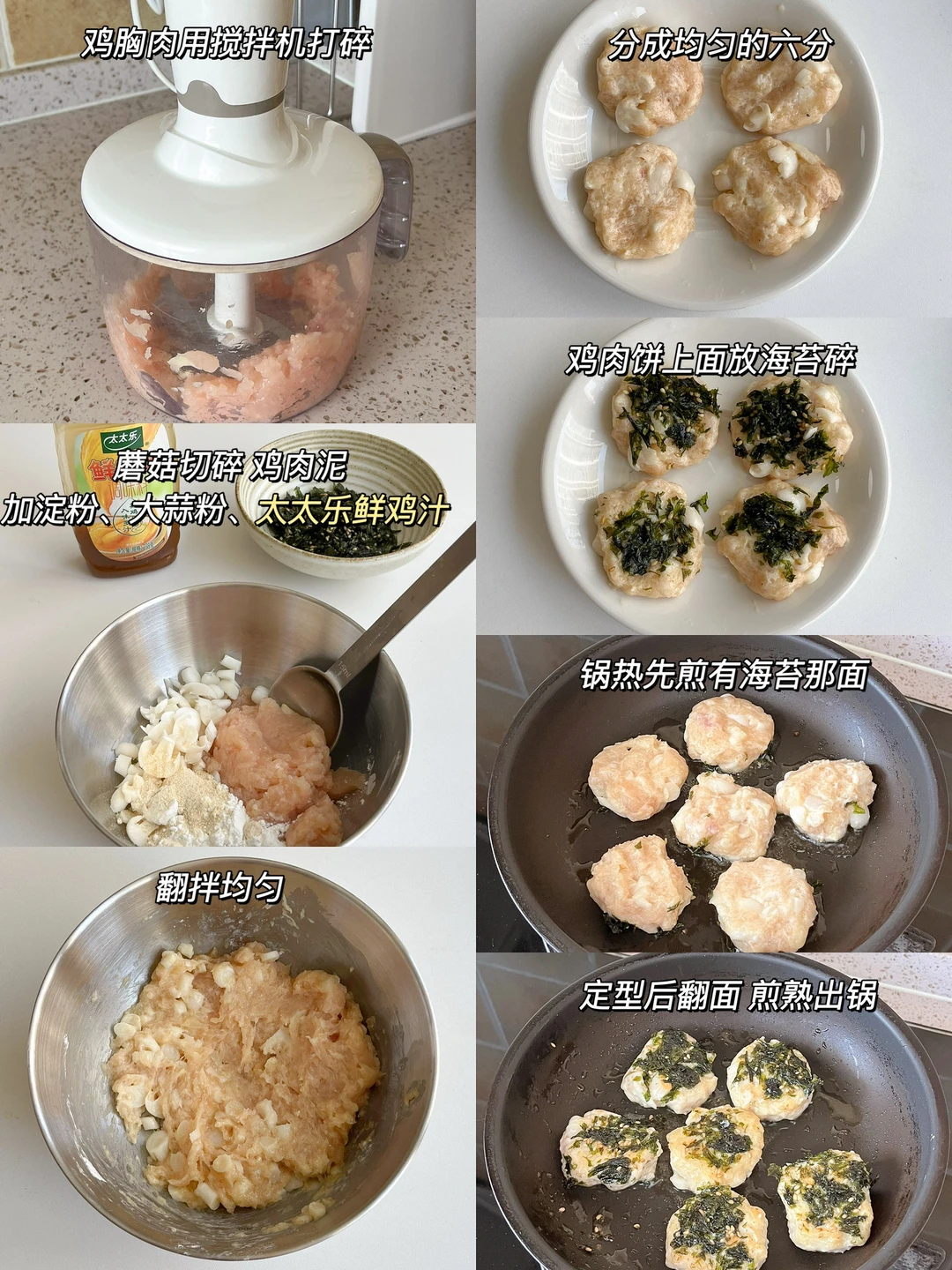搅拌均匀手里沾点水团成小饼 放上海苔碎