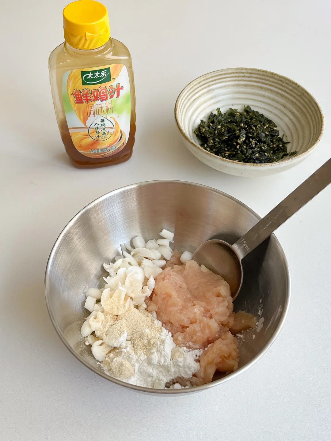 鸡胸肉打碎放白蘑菇、淀粉、大蒜粉