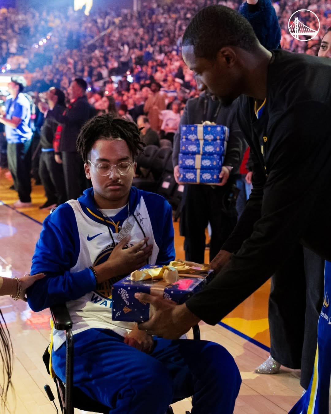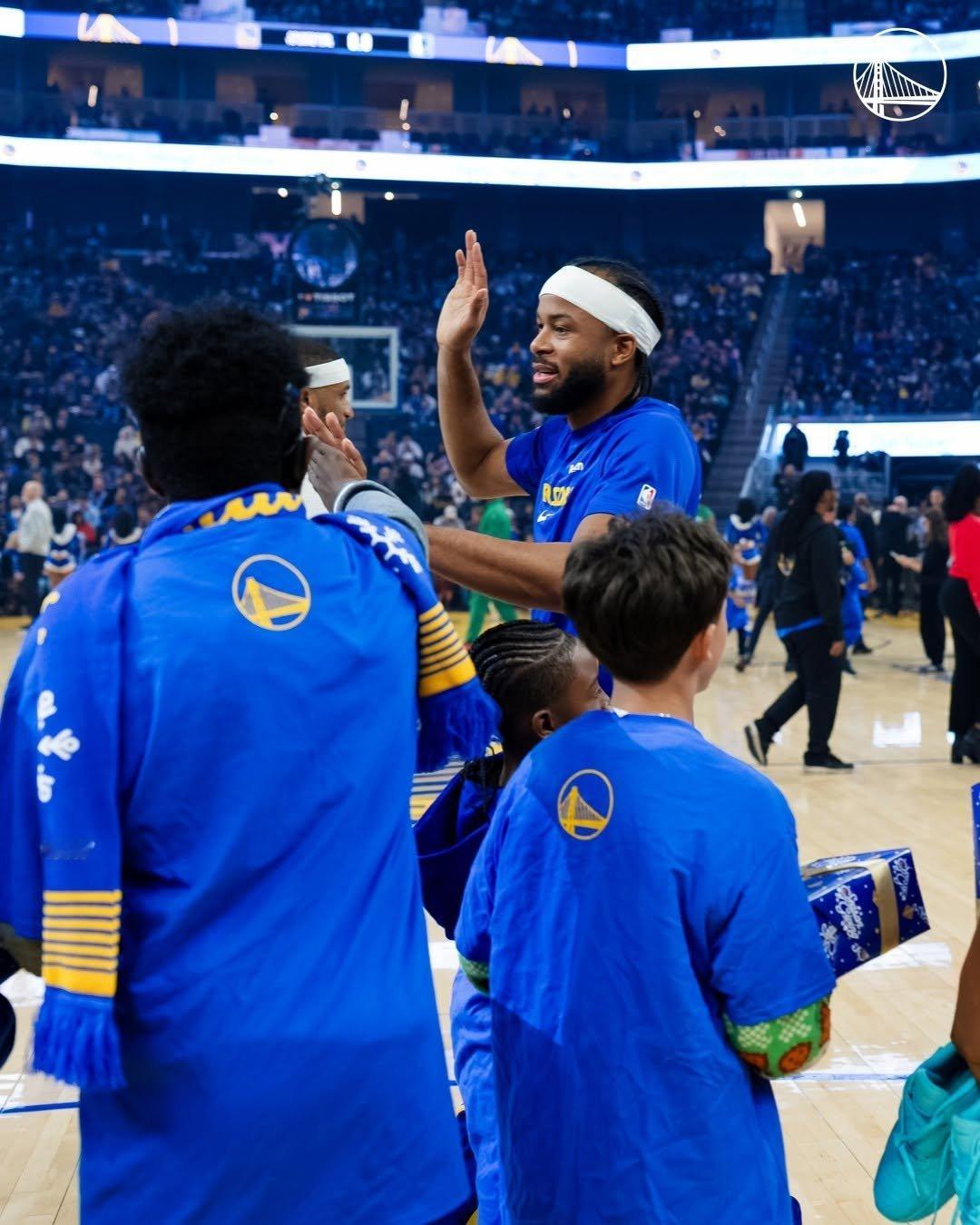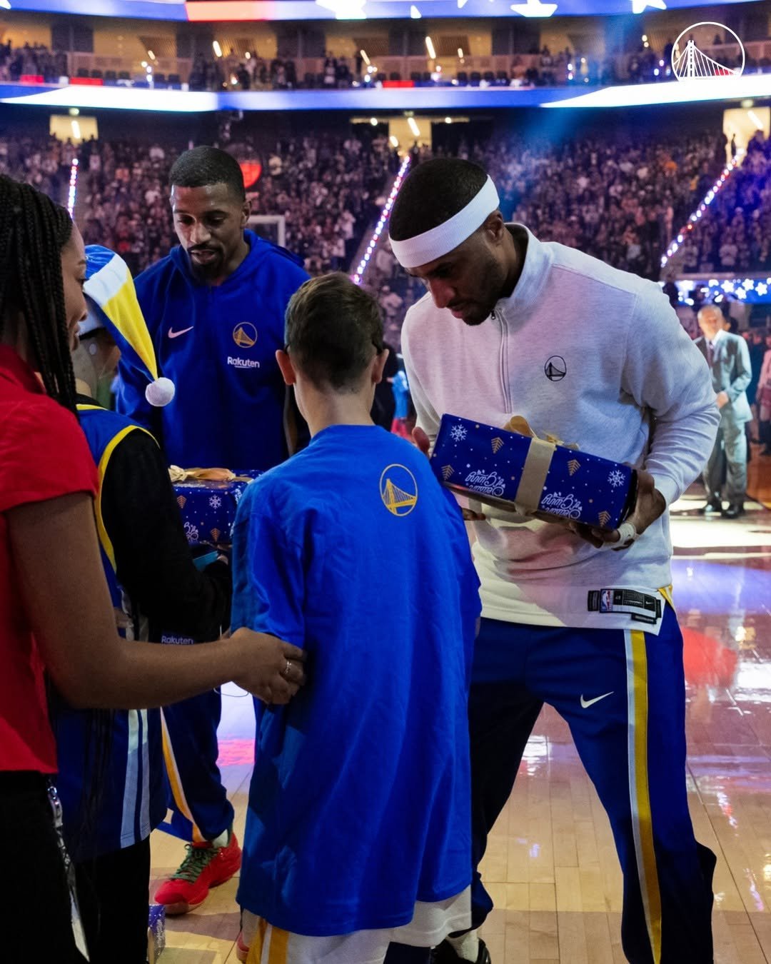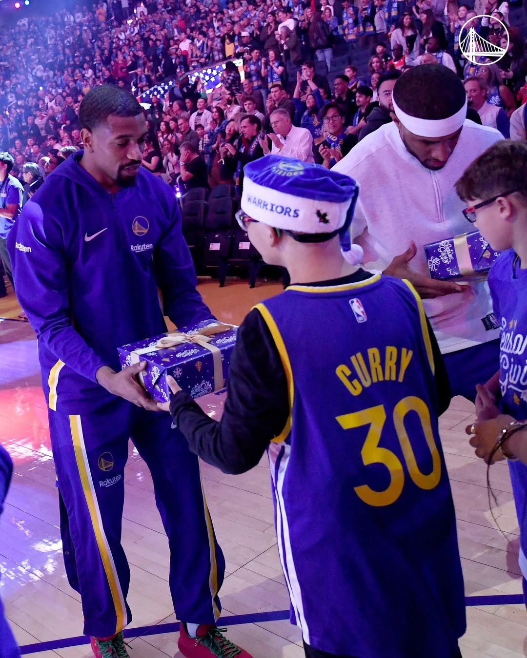 真有爱啊勇士队和小牛队与,向来自湾景基督教青年会和伯克哈尔特小学的当地青年赠送了礼物