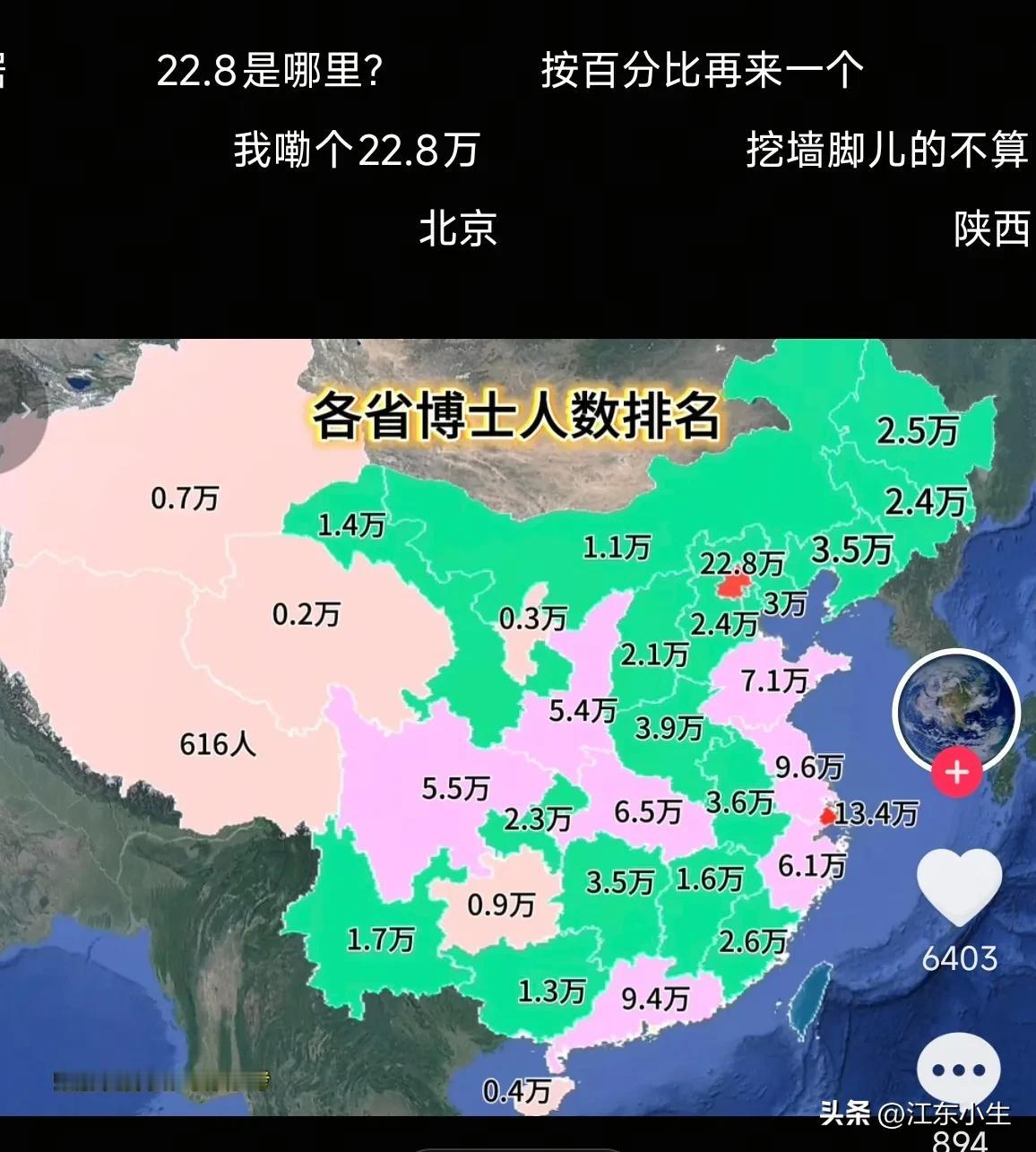 全国博士数量排名,北京、上海独占鳌头。 江苏超过广东,位列全国第三,长三角第二。其次是山东与浙江。 福建让人意外,博士数量不如安徽、河南。 爱做生意的福建人果然名不虚传。 人数排名倒数的是西藏,青海,甘肃,贵州。 这个博士数据跟各地经济明显呈正相关关系。