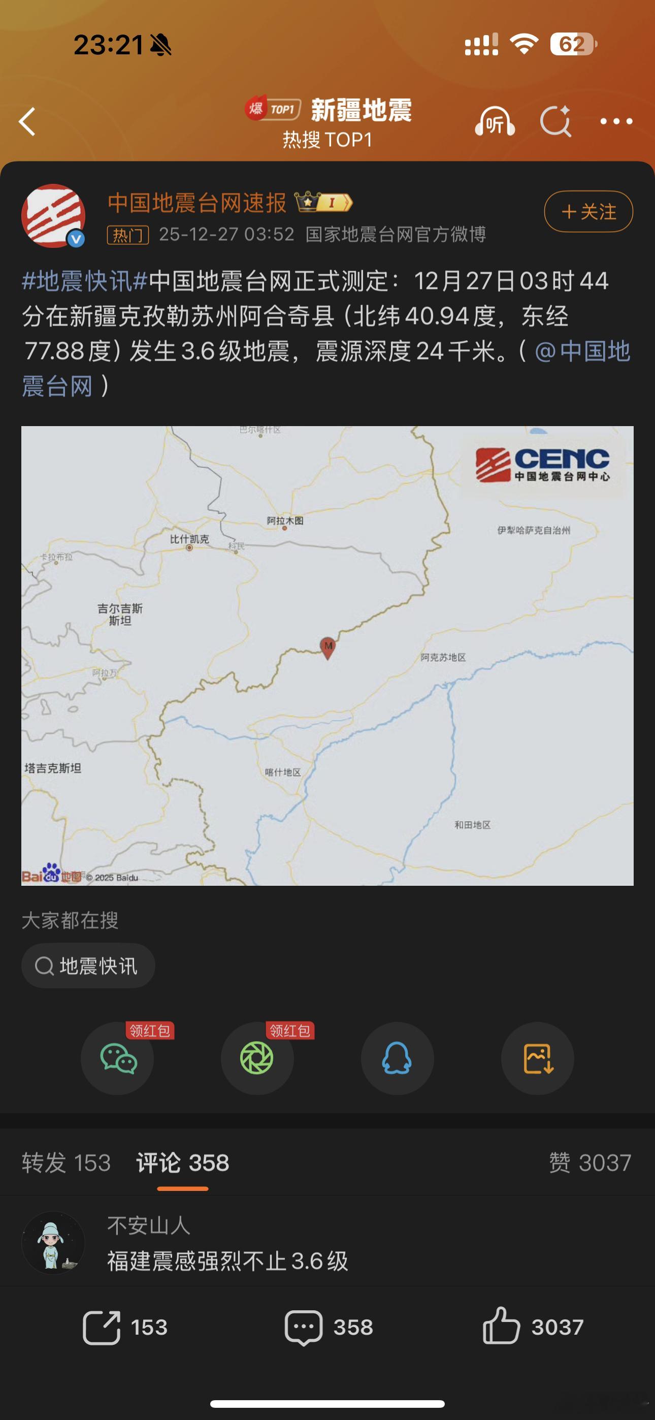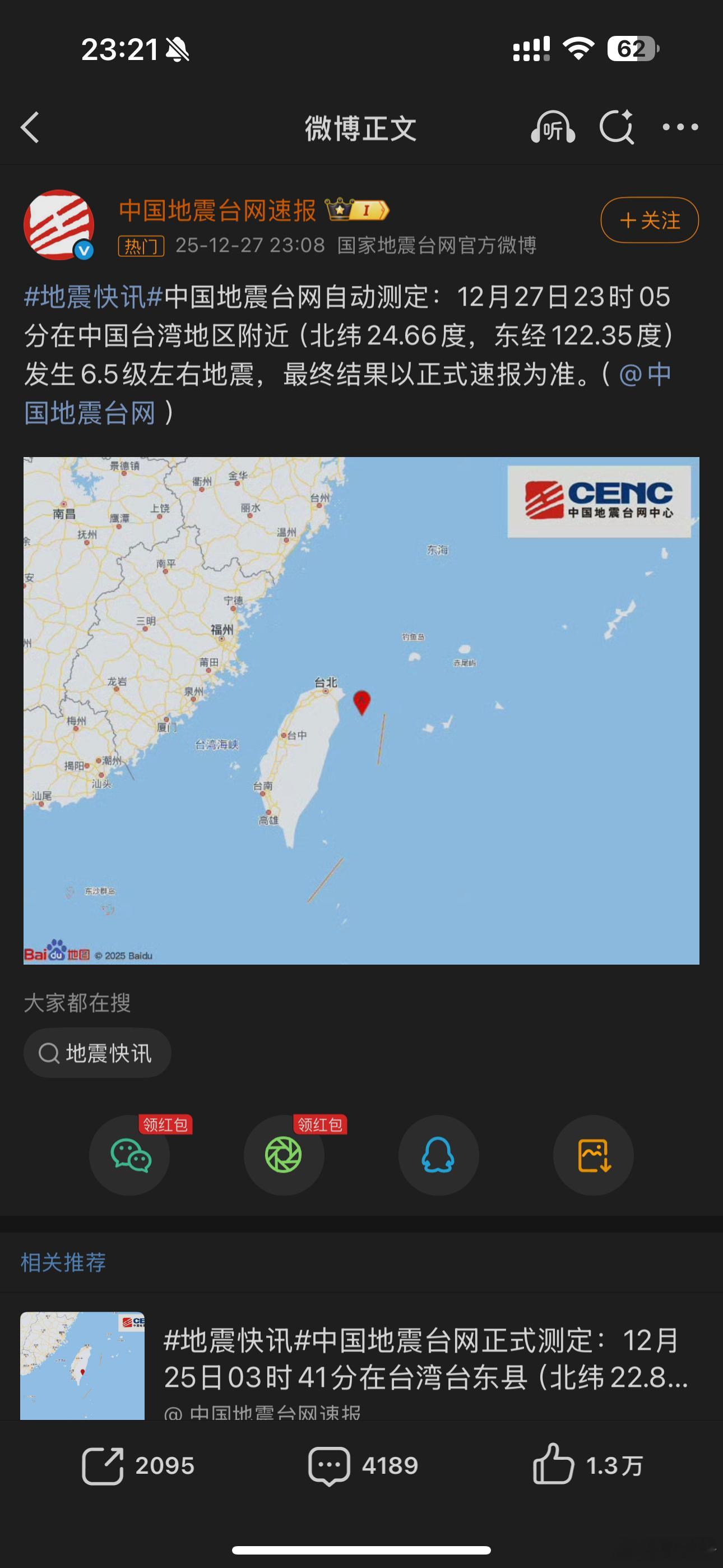 我国对角线同一天地震?台湾附近6.5级左右地震新疆地震