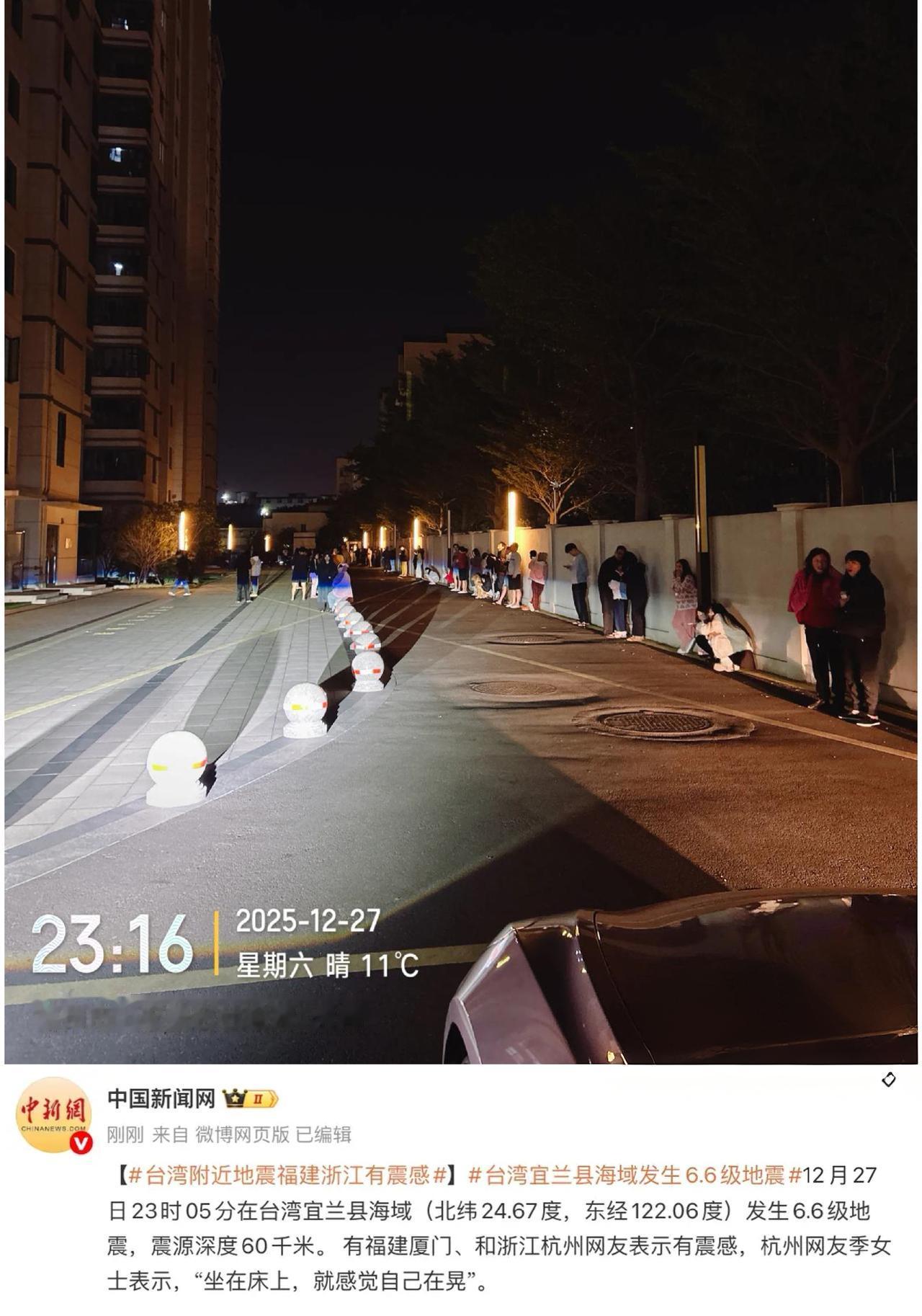 突发! 台湾宜兰县海域发生6.6级地震! 我在福州市, 感受到了震感,床轻微晃动,我还以为是我老公在晃床,叫他不要晃,然后就看到我家窗帘一直晃,窗子在想,我就猜肯定是哪里地震了! 福州震感明显。 第一次遇到,一家人立马跑下去,在外面呆了十几分钟。 福州人淡定,一栋楼以为就我们家跑出来了,结果楼下都是人,远离高楼在玩手机,看看地震严重吗。[捂脸]