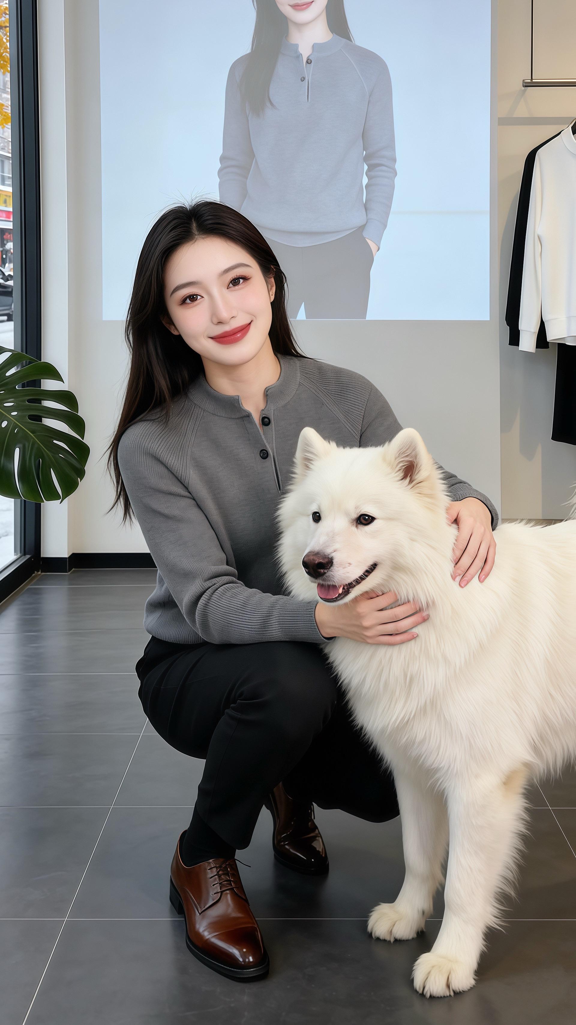 北城的雪粒敲着男装店的落地窗,暖灯将龟背竹的影投在深灰地砖上。皓明推开门时,许妍正蹲身环着萨摩耶的脖颈,长发垂落肩头,抬眸时笑意温润,像融了糖的热拿铁。