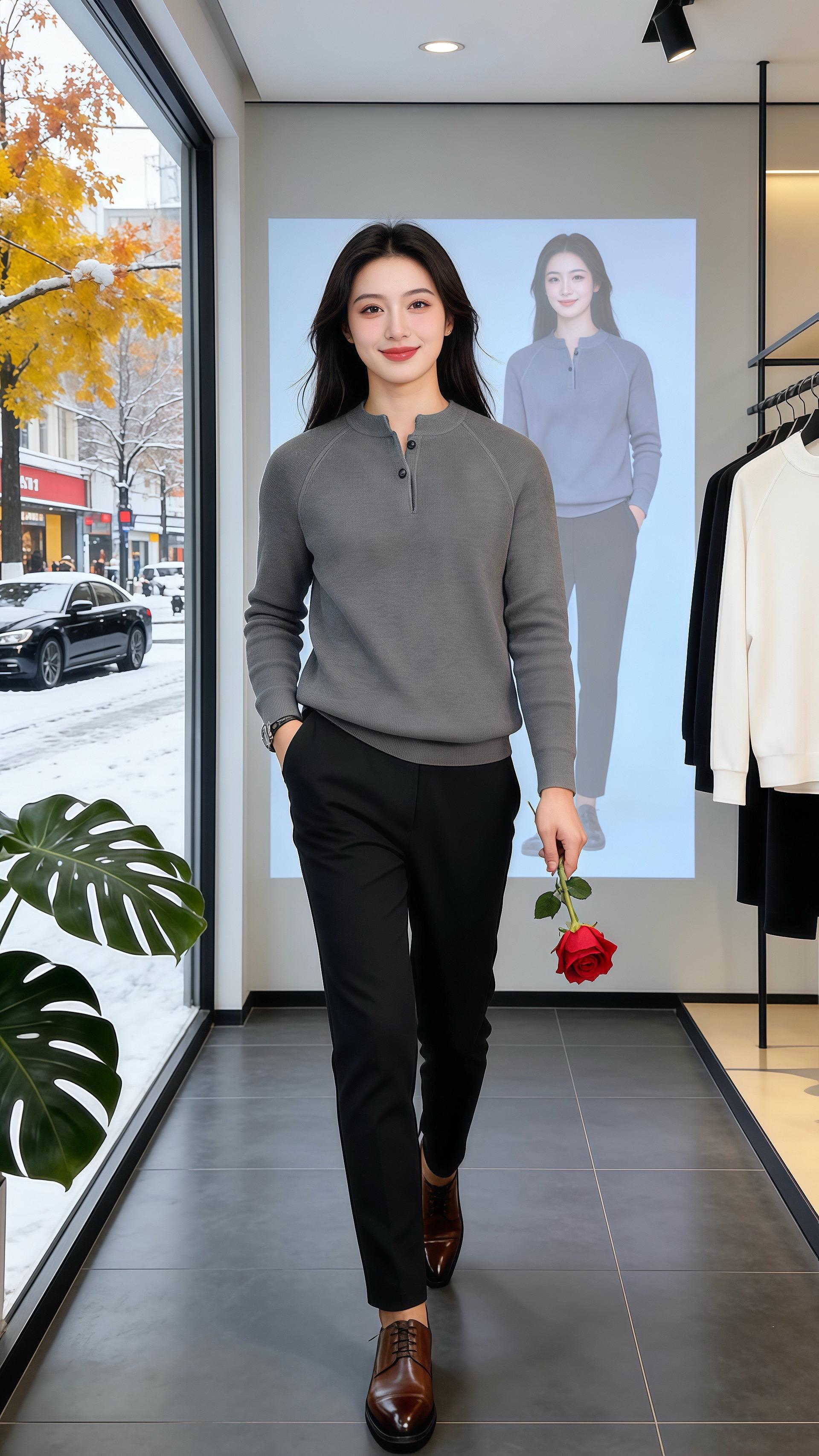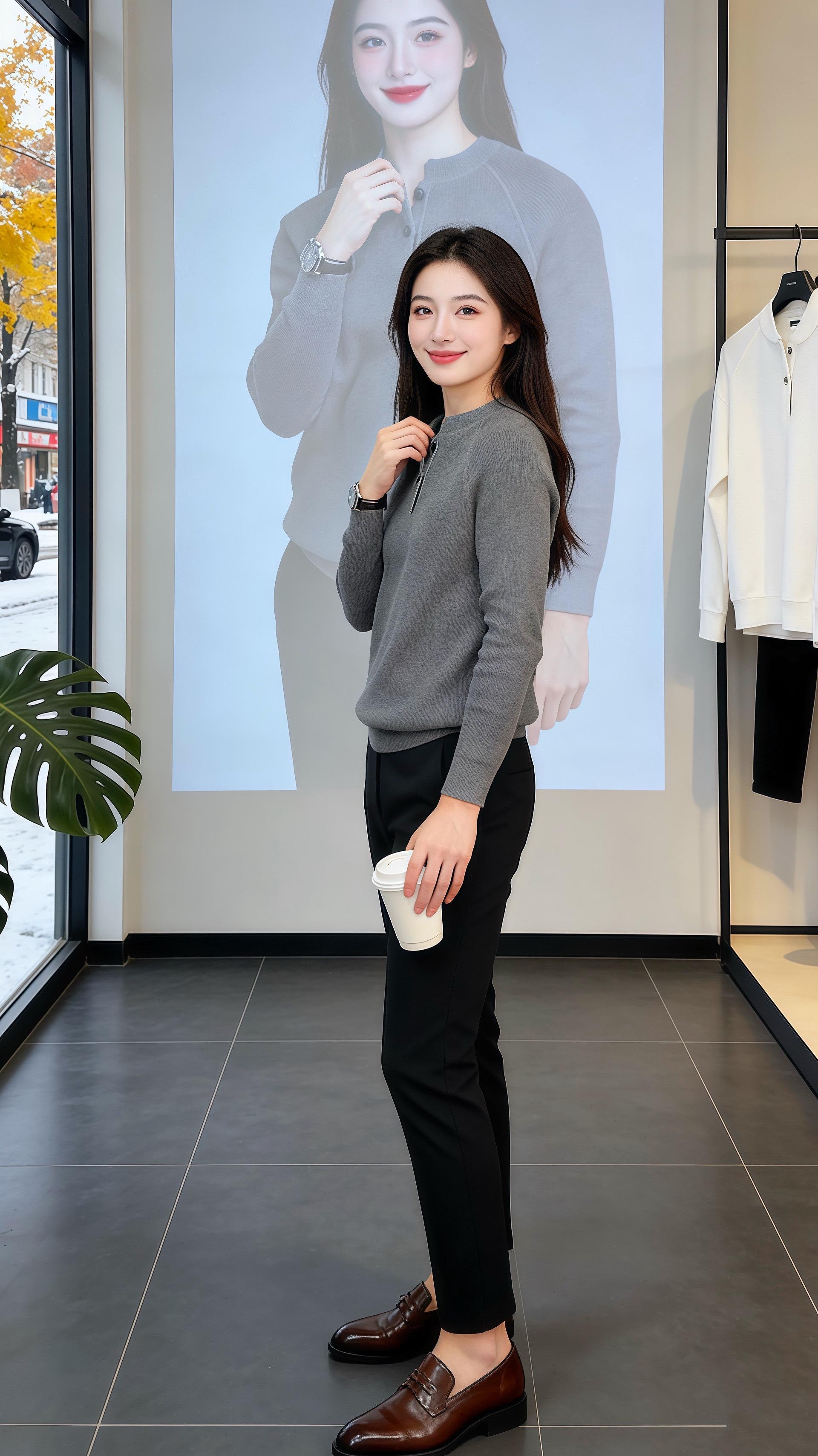 她穿的灰色半开领针织衫,软糯的肌理衬得身形温婉又利落,领口的纽扣设计添了简约的层次感,衣身的坑条纹理让整体多了几分质感;下配黑色长裤垂顺有型,裤脚收得利落,棕色皮鞋的点缀让搭配更具精致感,这般穿扮,像冬日里的羊绒披肩,沉稳中裹着温柔的暖意。