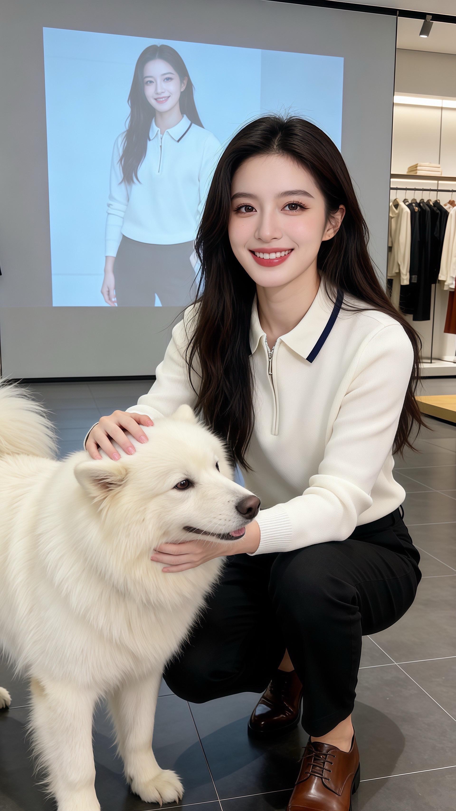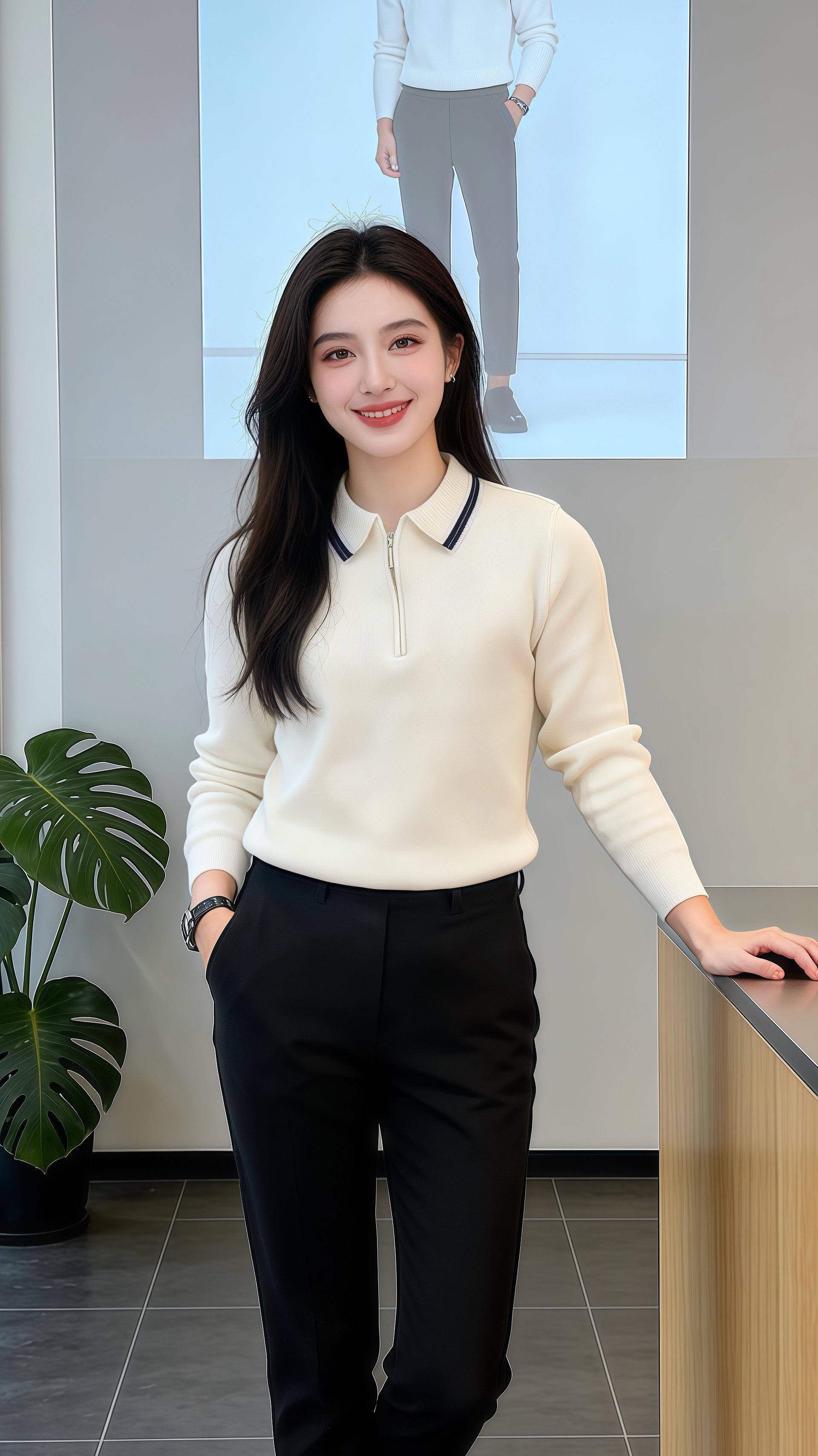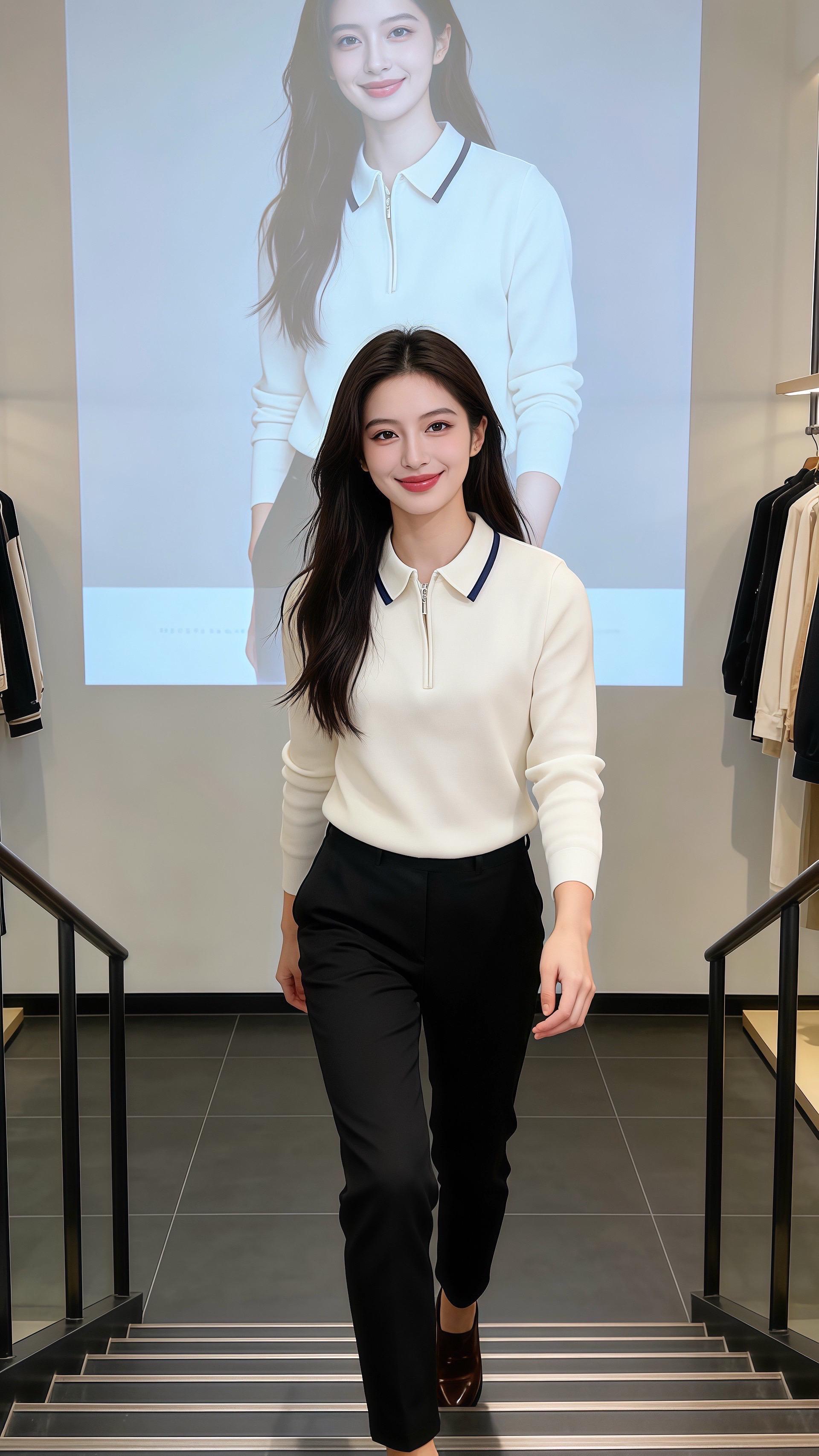冬雪擦过男装店橱窗的午后,他推门进来,一眼撞进她米白针织衫的温柔里。领口的黑边像描了笔精致的墨,针织面料的软贴在肩线,配着垂顺的黑裤与棕皮鞋,把冬的冷冽揉成了温润的暖。 她蹲身揉萨摩耶的头,袖口的罗纹贴在腕骨,比橱窗里的成衣更鲜活。他递过狗零食时说:“这米白像刚融的雪,衬得你干净又温柔。”她笑,捻了捻领口黑边:“随手搭的,竟和店里的黑胶唱片刚好衬。” 出门时他替她拂去肩头雪,指尖擦过针织面料。他忽然懂了,好看从不是衣装,是她把米白的柔、黑的静,穿成了让人心跳慢半拍的刚好。