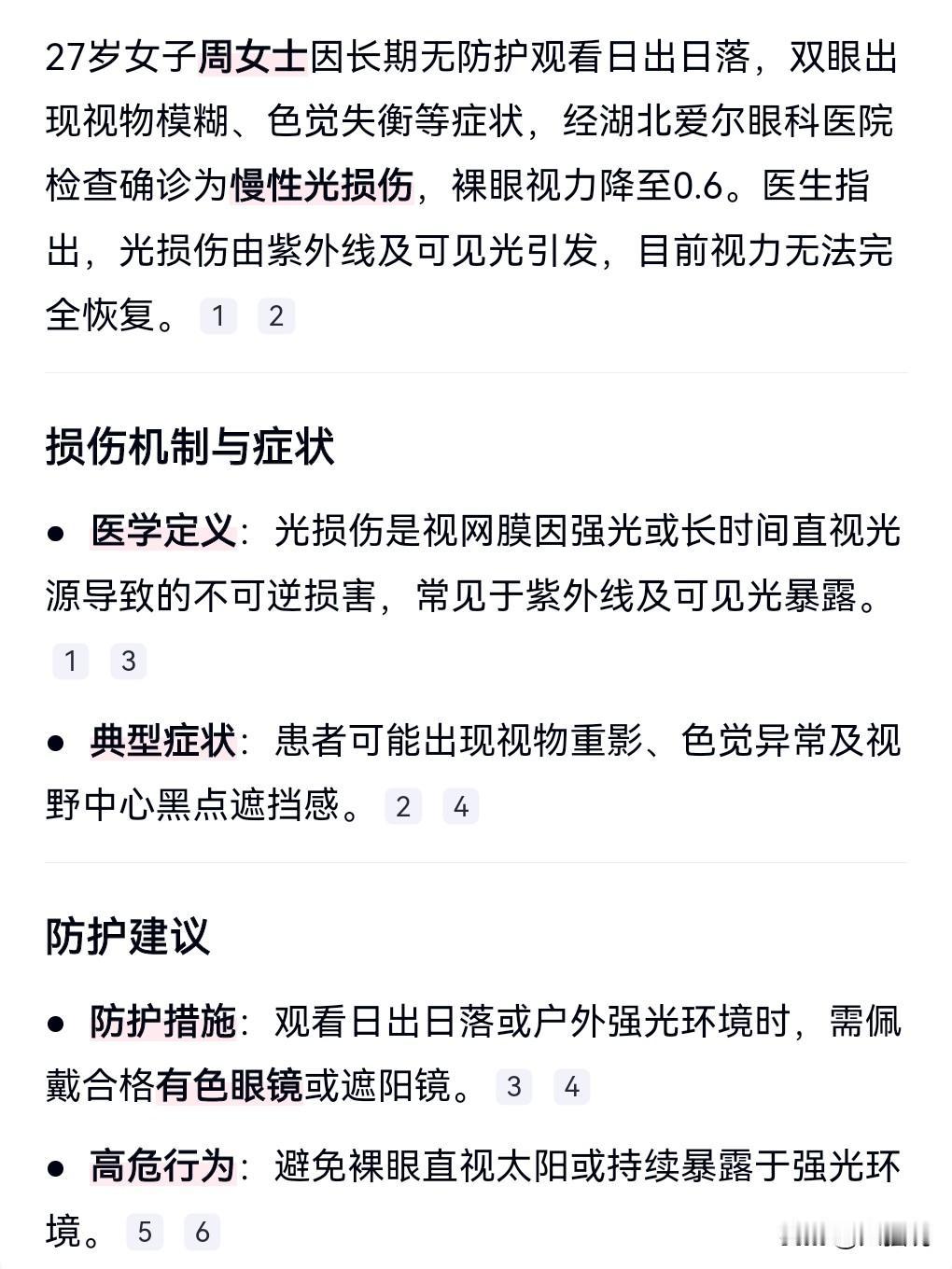 想不到还有爱看日出日落到这种程度的人。 女子爱看日出日落。双眼被“晒伤”。 长时间盯着太阳看。 导致自己的视力受损。 这可真是敲响了警钟。 太阳光那么强烈,肯定不能长时间的注视。