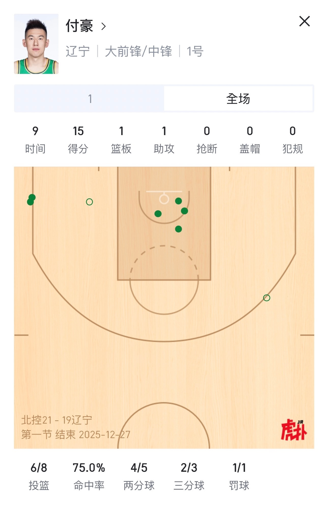 第一节全队19分,付豪拿下15分,威尔斯3分,莫兰德1分。大付豪北控男篮vs辽宁
