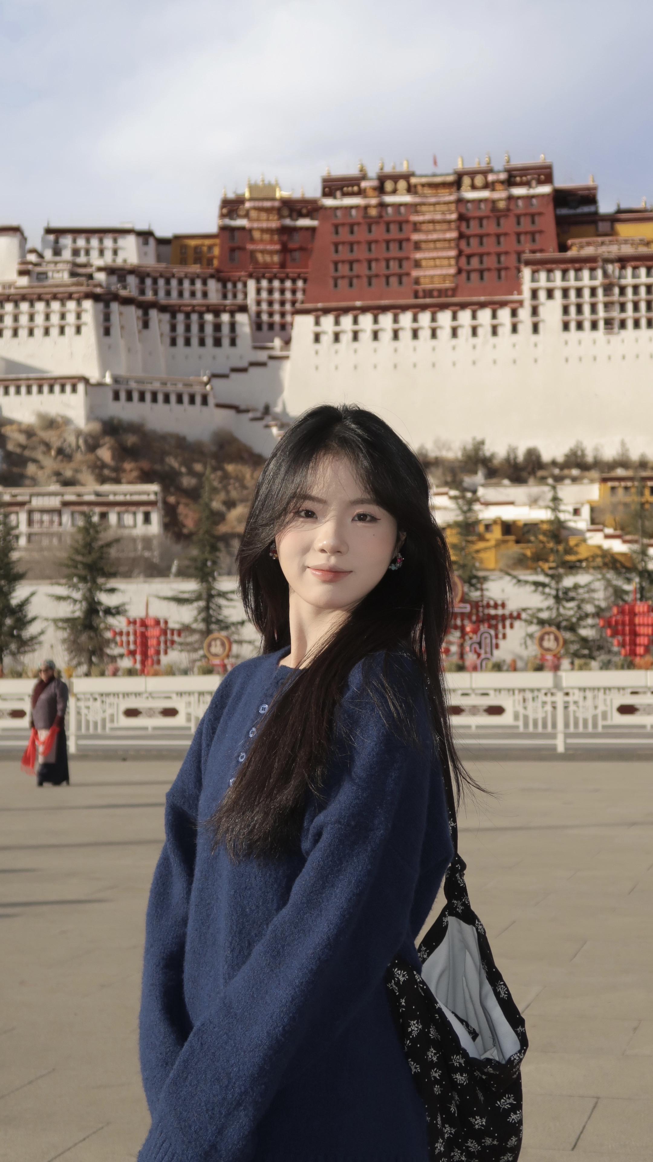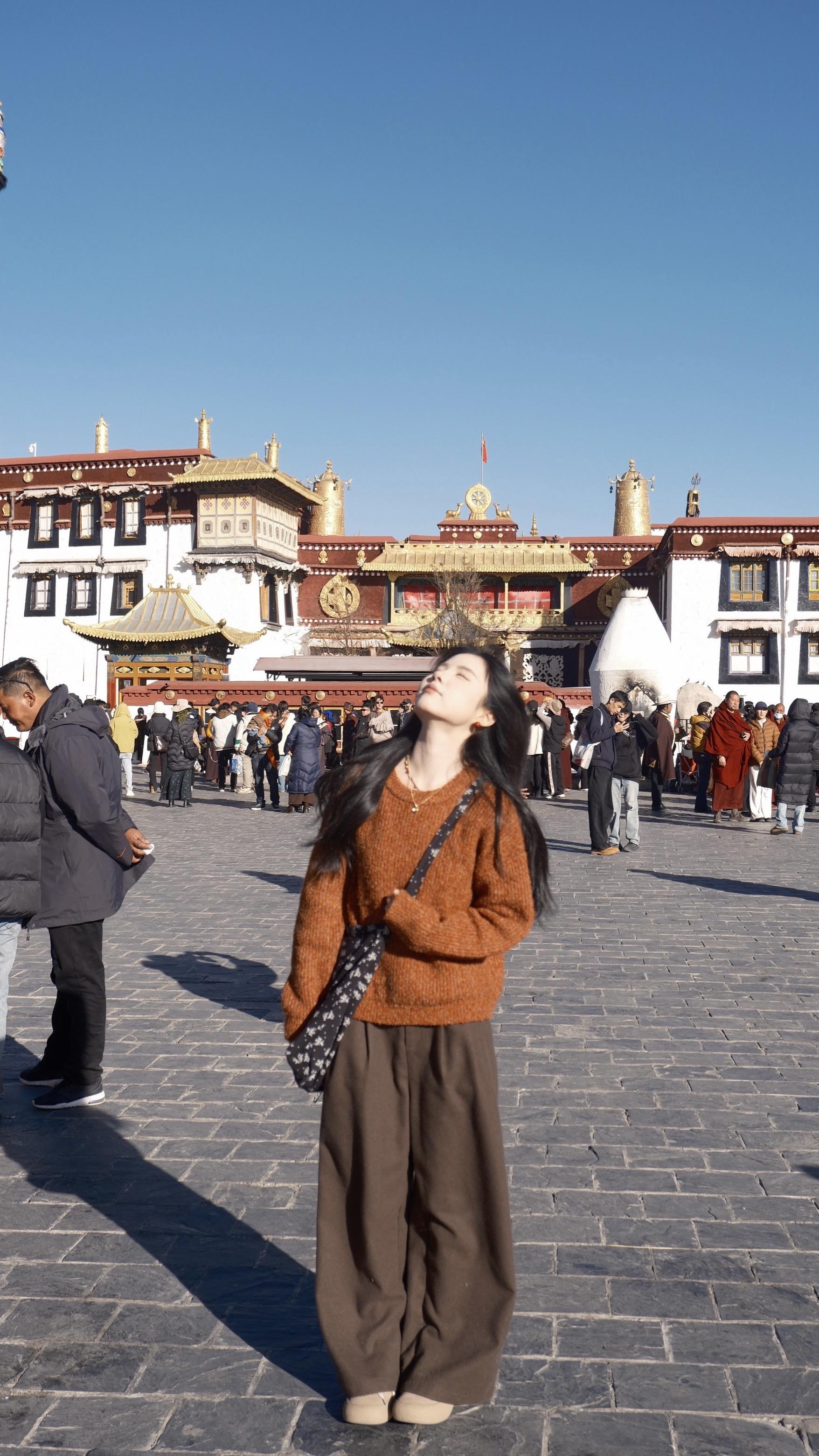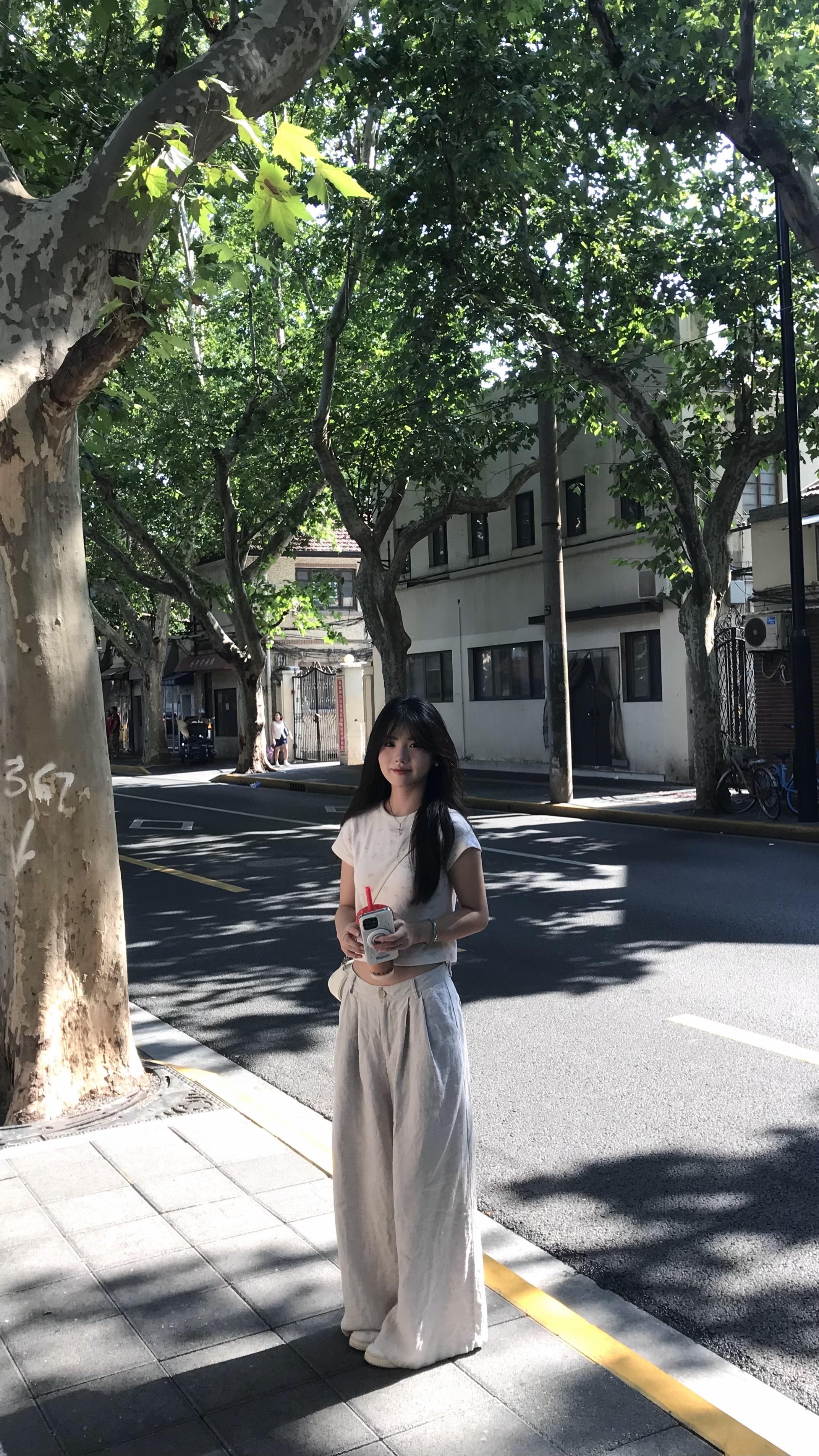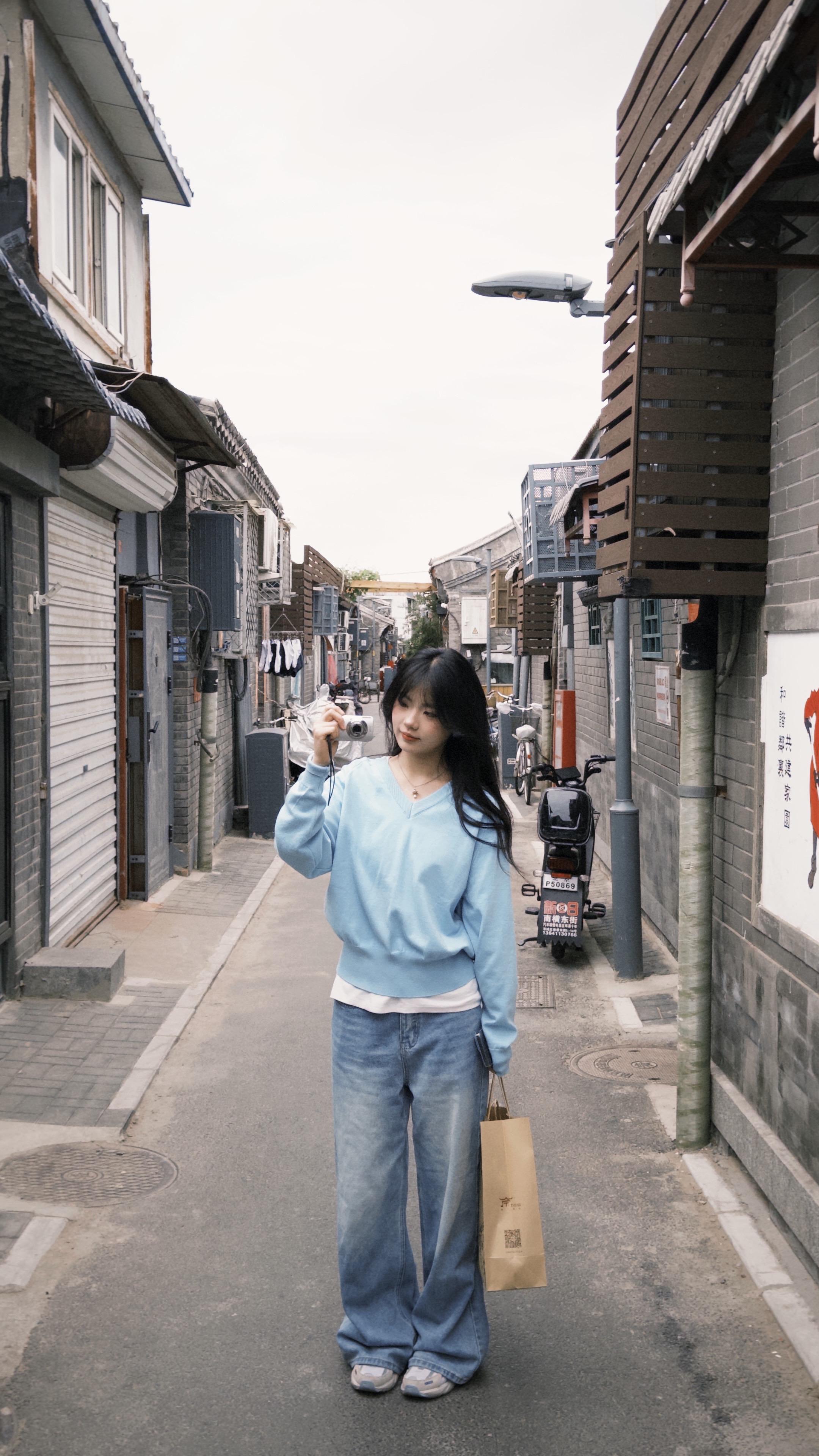 优雅东方韵,浅蓝上衣配米色长裤,漫步古风庭院,尽显时尚与古典的完美融合。