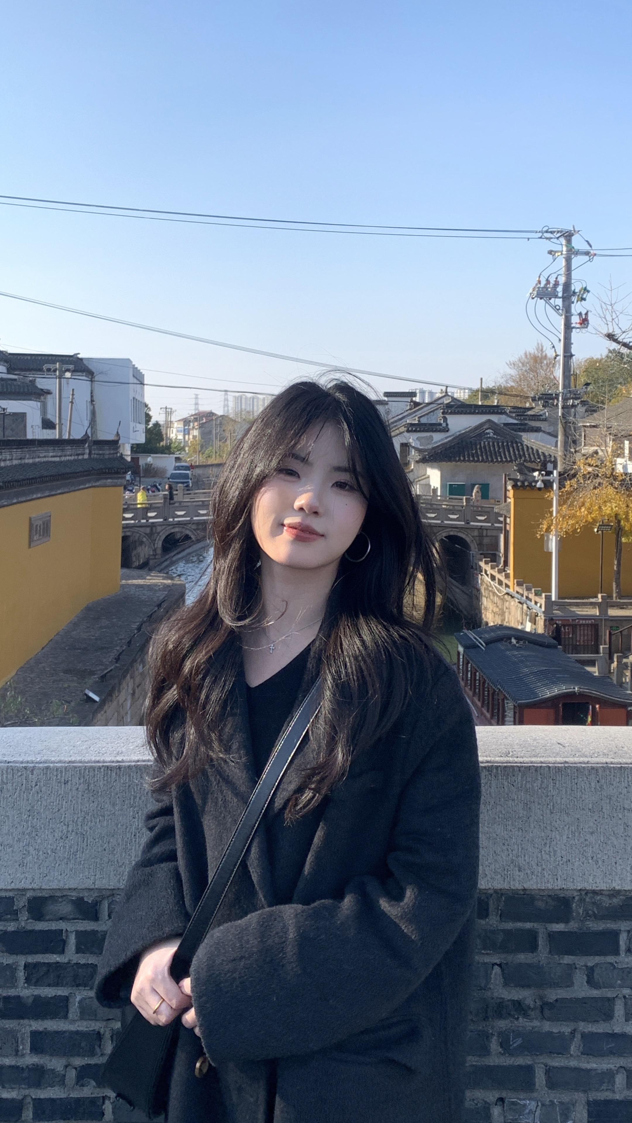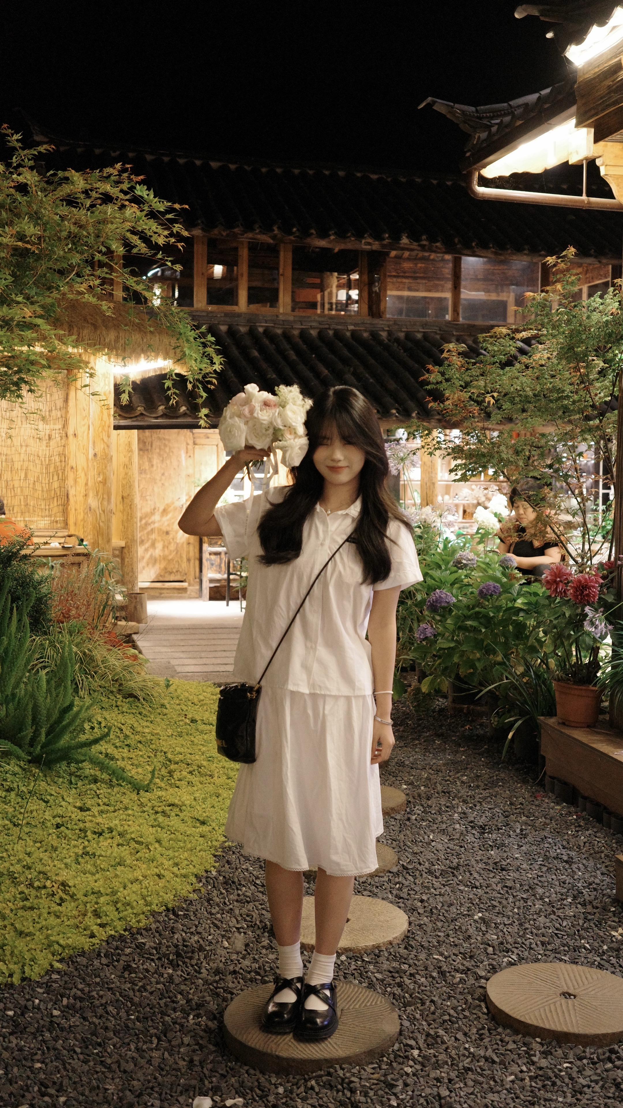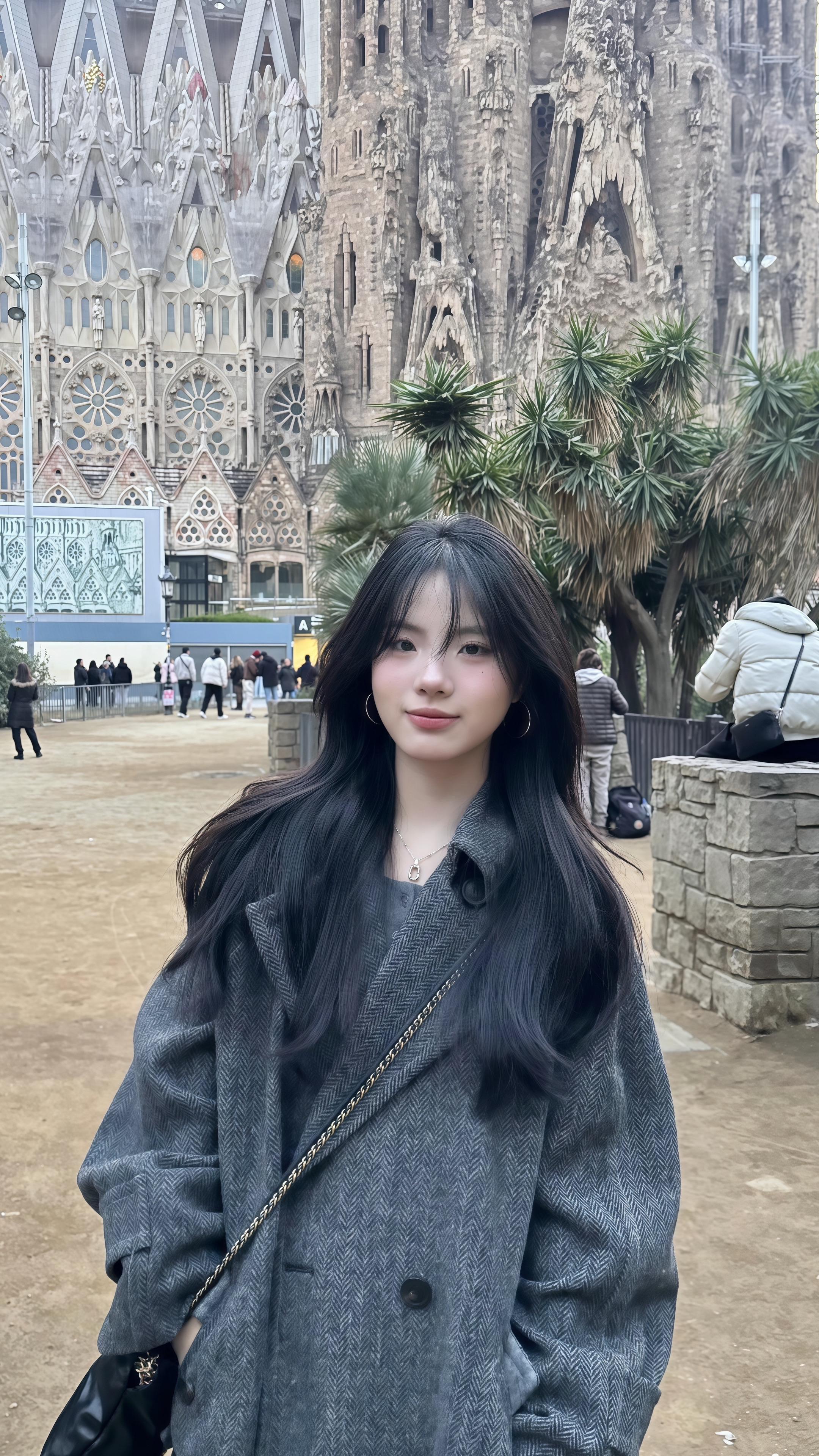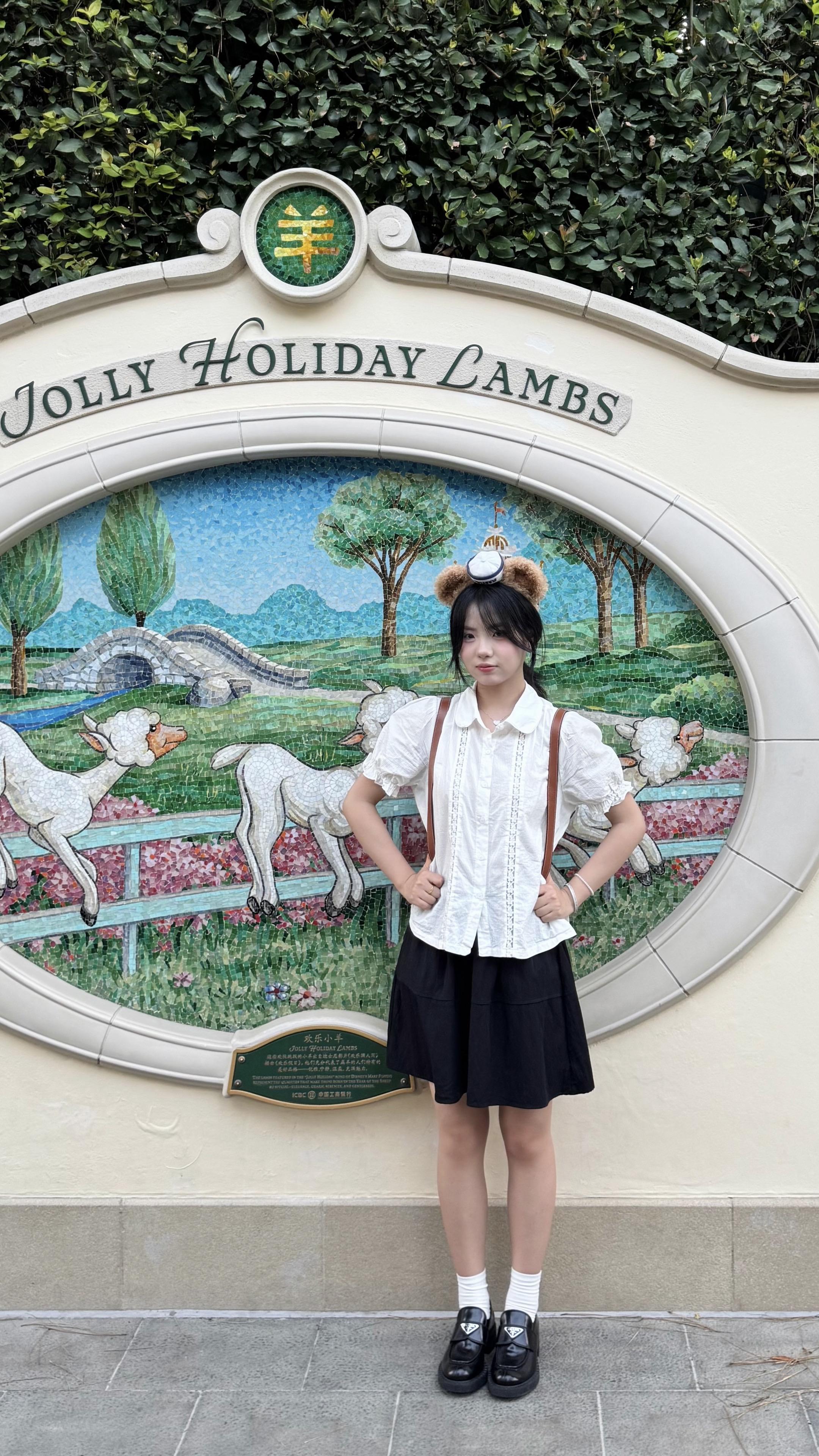 优雅东方韵,浅蓝上衣配米色长裤,漫步古风庭院,尽显时尚与古典的完美融合。