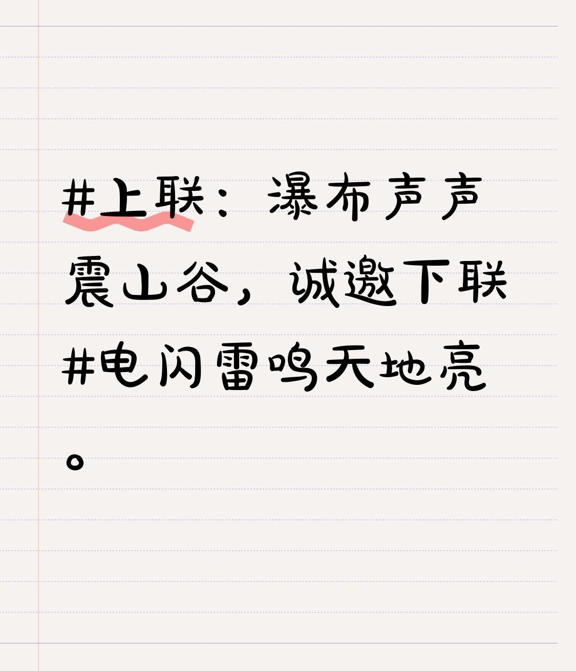 上联:瀑布声声震山谷,诚邀下联电闪雷鸣天地亮。