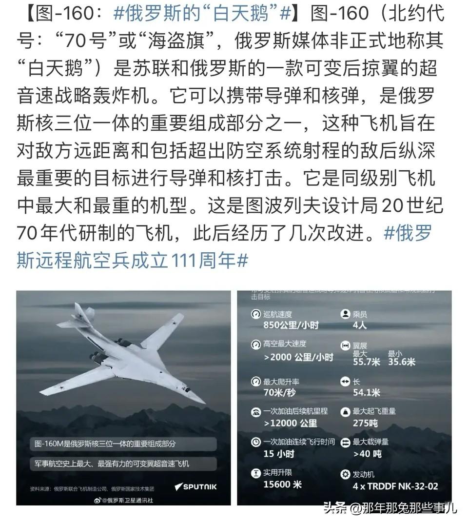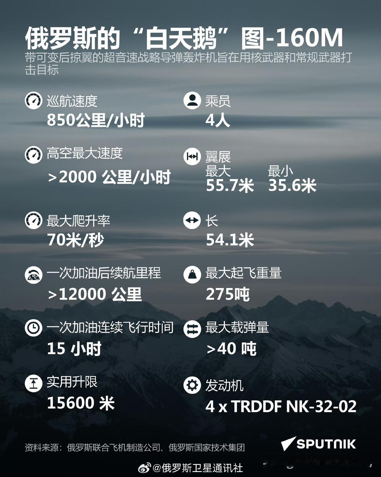 来自俄媒的图-160“白天鹅”数据 要说战略轰炸机里的“颜值与实力双担当”,图-160绝对排得上号,54.1米的机长搭配可伸缩翼展,最大275吨的起飞重量,往天上一飞就自带威慑力。 4台NK-32-02发动机堪称“动力猛兽”,高空能飙到2马赫以上,巡航速度也稳在850公里/小时,15600米的实用升限和70米/秒的爬升率,让它在同类机型里稳占上风。载弹量超40吨的配置,再加上一次加油12000公里的续航,老版就已经够能打,新版图-160M更是把航程拉到16000公里,续航能力直接升级。 对比美国B-1B,图-160在载弹量、速度和航程上都有明显优势,尤其是NK-32发动机的技术水准,放在全球都属于顶尖行列。 不过超音速突防的模式放到现在,实用性确实打了折扣,复杂的操作流程和繁琐的后勤维护,也让它的出勤率受到影响。