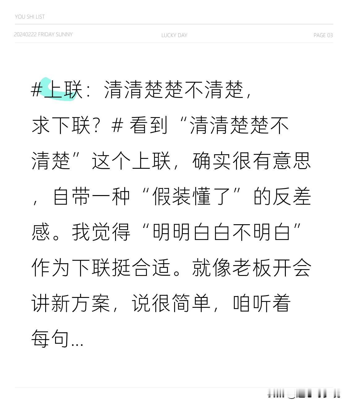 看到“清清楚楚不清楚”这个上联,确实很有意思,自带一种“假装懂了”的反差感。 我觉得“明明白白不明白”作为下联挺合适。就像老板开会讲新方案,说很简单,咱听着每句话都懂,不住点头,心里却犯嘀咕“到底要我干啥”;还有看菜谱,步骤写得明明白白,可炒出来的菜就是不对味,这就是“明明白白不明白”,和上联“看着清楚实则糊涂”对应得刚刚好,都体现了表面和实际的差异。不得不说,对对子还挺考验思维,也让生活多了些趣味。