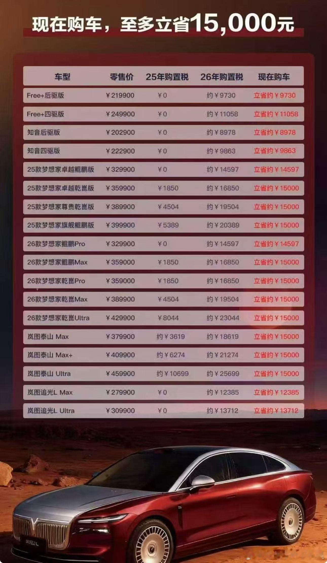 岚图的这个提醒做的蛮好的大v聊车新能源汽车岚图汽车 2026购置税起征额度减半岚图详细的列举了旗下的每一台车2025年买车购置税和2026年买车的购置税对比差异22万的车,26年买车的多付9730元25万的车,26年买车的多付11000元30万的车,26年买车的多付13000元33万的车,26年买车的多付14500元36万的车,26年买车的多付15000元额外增加的成本一目了然[嘿哈][嘿哈][嘿哈]