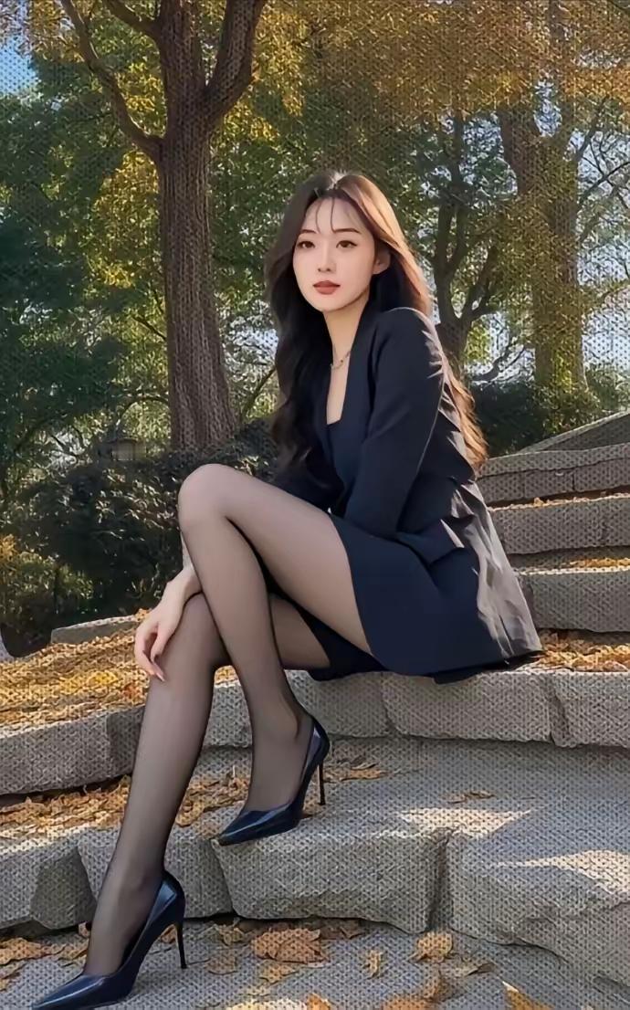 秋日暖阳下,优雅淑女坐长椅,复古波点袜与毛绒大衣相得益彰。