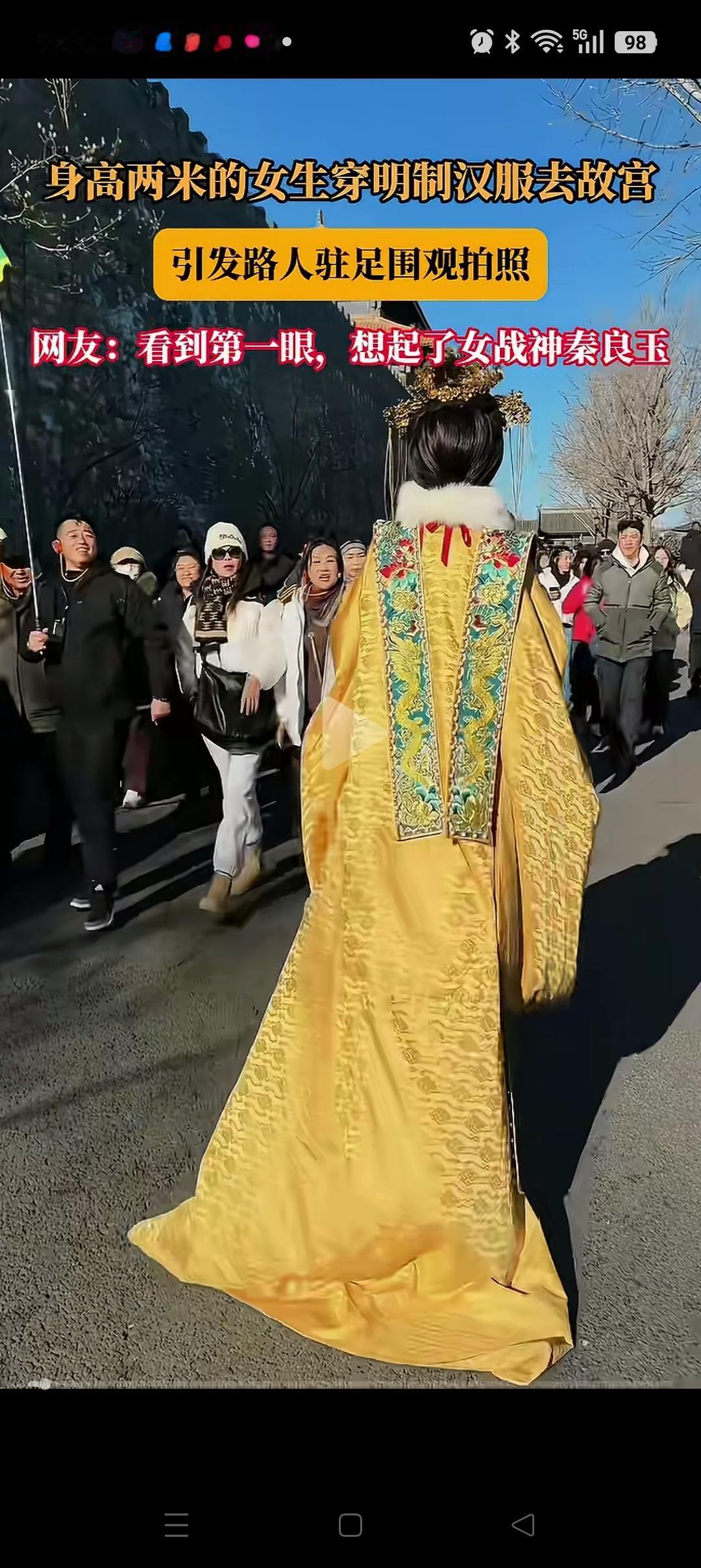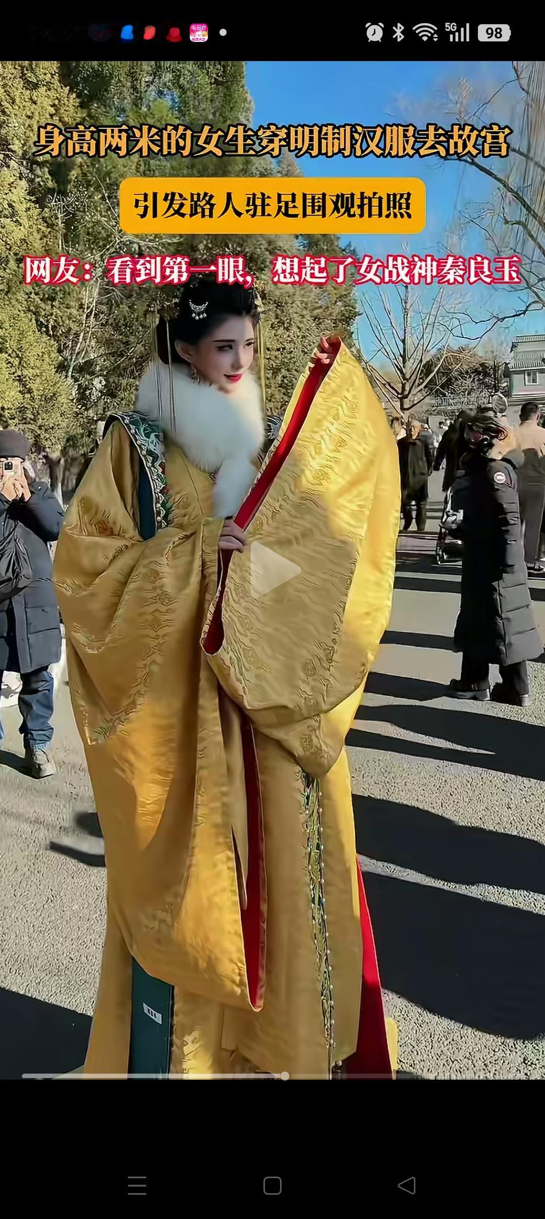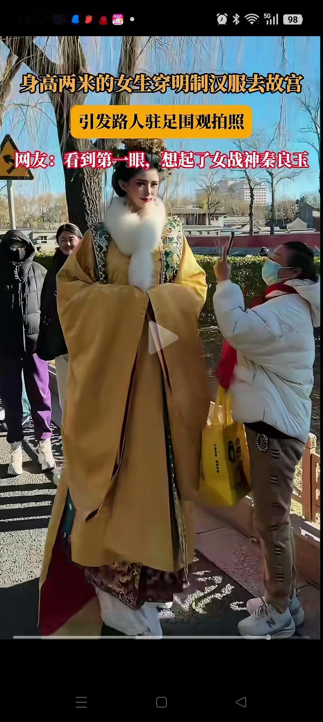 这下好了, 不仅国人,连外国人也感受到明制汉服的魅力了! 故宫,身高2米的女生穿着明制汉服在游玩,引来了路人的驻足围观,合影,连外国游客也投来了羡慕的眼光! 不得不说,明制汉服穿在她的身上,确实有一种独特的魅力,气质和气场直接拉满。 网友更是感慨:这才是真正的文化自信! 记得今年去故宫旅游,穿汉服的年轻人越来越多了,这真的是一件好事。 大家觉得好看吗?像不像女战神秦良玉[呲牙][呲牙]
