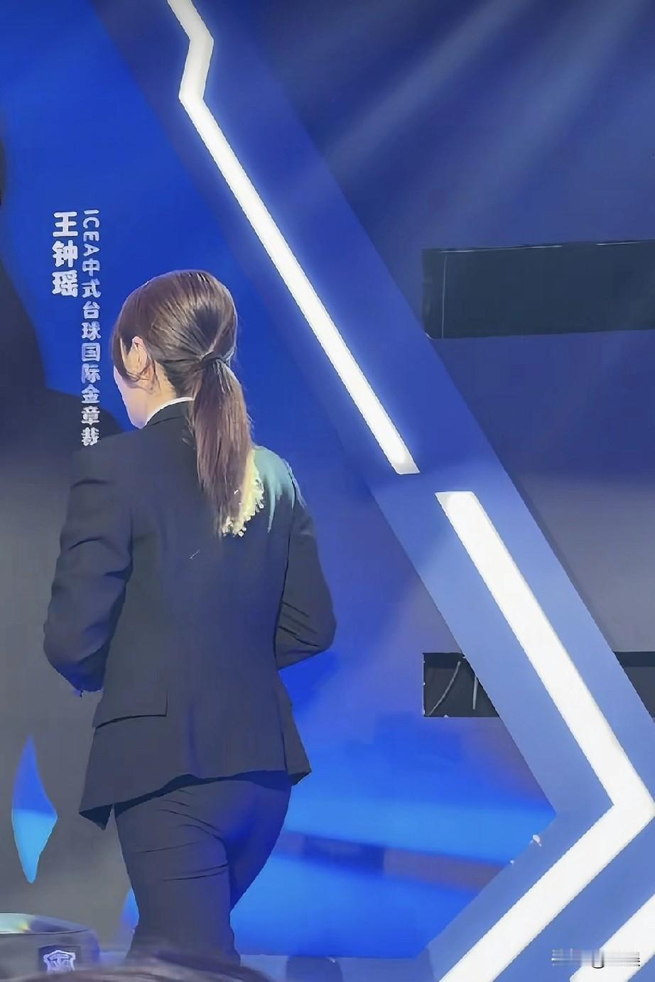 在舞台的聚光灯下,王钟瑶一身干练的黑色西装,马尾利落,手持水瓶