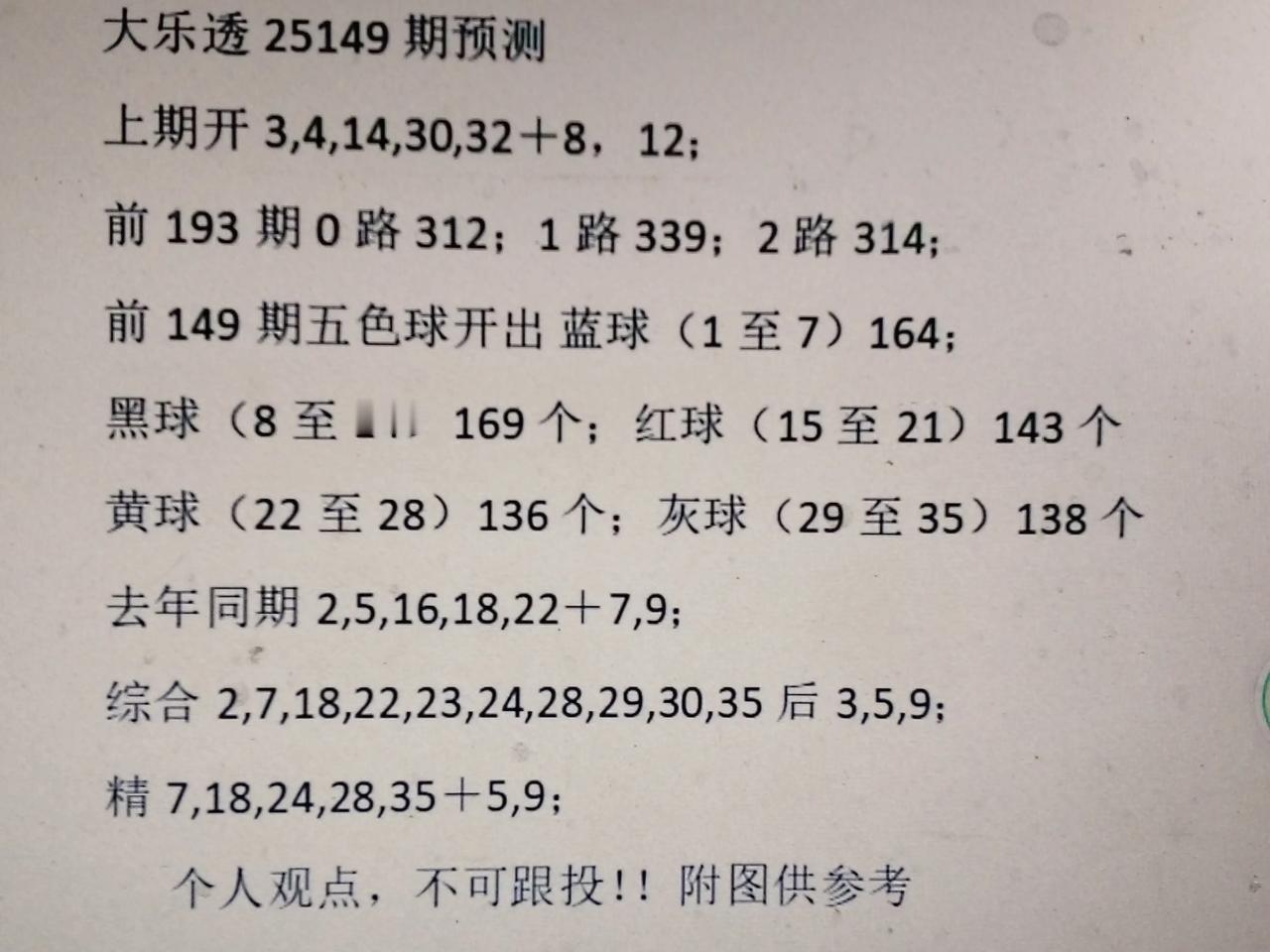 上期前区开出全小尾号,无2字头。三期开出2个红波号,本期估计有3一4个红波号开出,7,13,18,24,29,30,35。 后区上期又开全大数,全偶数红波号,估计本期是小数奇数。3,5,9有号开出!
