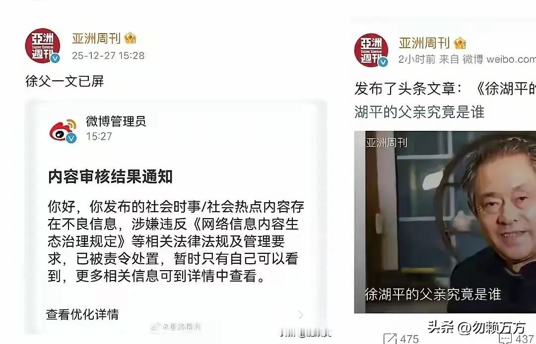 亚洲周刊所发的一篇文章被平台屏蔽,仅自己可见,原因是涉嫌违反《网络信息内容生态治理规定》。 处罚有据可依值得点赞,但更好是能具体地指出来违反了哪项条款,既然是“涉嫌违反”,那也应该要有申诉成功的可能性。 分析一下处罚原因,我觉得可能是因为涉及他人的家庭伦理问题,当事人也80多岁了,他的父亲应该是确定的,现在文章却要问“究竟是谁”,这就可能误导大家产生不好的联想。应该是这个原因吧?徐湖平