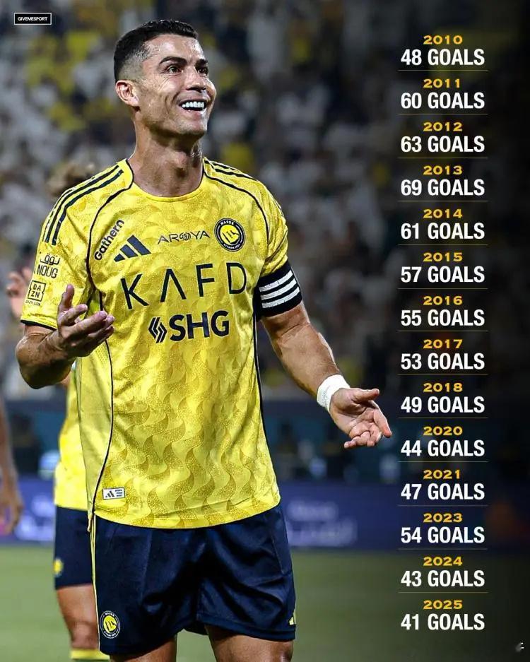 历史第1!40岁C罗1300场1262球:14次1年40+斩杀 6个月内冲2遗憾北京时间12月28日凌晨,沙特联赛,利雅得胜利主场3-0击败阿科多。此役,40岁的C罗打进2球,是球队获胜的最大功臣。开赛前10轮,C罗率队豪取10连胜。此外,C罗生涯中已经参赛1300场。本场比赛,C罗足够活跃,他对进球充满了渴望。第9分钟,C罗头球破门,但顶偏了。第15分钟,C罗的一脚射门踢在横梁上。第17分钟,C罗直接任意球射门,门将将球扑出。经过这几次的尝试后,C罗在第31分钟终于破门。菲利克斯开出角球,前点队友头球后蹭,C罗在中路跟上,抢点打入空门!1-0,利雅得胜利取得领先。进球后,C罗做出标志性的siu庆祝动作,并接受队友的拥抱。半场结束前,C罗在中路卡住位置,侧身面对球门。队友将球传过来,C罗用一个非常精彩的脚后跟射门将球打进,对手的后卫和门将都看呆了,呆在原地一动不动。C罗上演梅开二度的好戏。第67分钟,C罗再次打进一球,但因队友越位在先被判无效,C罗对此很是无奈。补时阶段,菲利克斯将比分锁定为3-0。这场比赛,C罗踢满90分钟,射门5次,射正3次,28次触球21次传球,打进2球。赛后,C罗毫无争议地当选官方本场比赛的最佳球员。对于C罗来说,这场胜利还有着特殊的意义--这是他的第1300场正式比赛。在足坛历史上,C罗是第一个出场次数达到1300的非门将球员。在这1300场比赛中,C罗是逆天的存在,他一共打进956球,还助攻306次,独造1262球。同时,C罗在2025年自然年的进球数达到了41个,这是他第14次在一个自然年里的进球数来到40+。对于40岁的C罗来说,他职业生涯主要还剩2个挑战(也可以说是遗憾):沙特生涯至今0冠、世界杯0冠!未来的半年时间里,C罗将向着这2个目标发起最后的冲击。