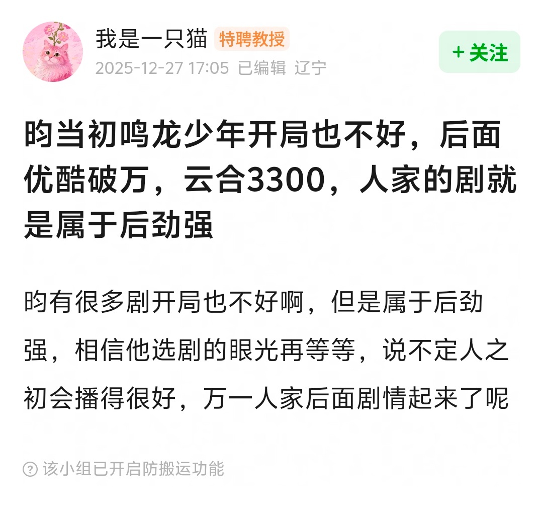 其实我不理解这个选剧眼光指的是是啥,鸣龙少年我看了能有十几集吧,好像到边晓晓在山里受伤那集,这个剧的槽点八张嘴同时说都说不过来主角团都是差生从高三开始学就能全员600分,男主请的老师看似大神但都不咋教怎么应试啊当然素人李的角色我更get不到,我那会儿就很诧异到底哪来的神人能把校园80的受害者和加害者组cp两边我都越来越烦就弃剧了