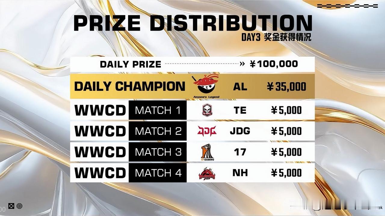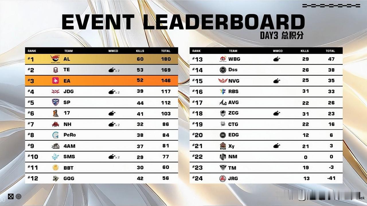 AL一鸡未吃再夺单日冠军! Race赏金赛第三天比赛结束 AL第一、TE第二、EA第三、JDG第四 这AL上次赏金赛也是奖金榜第一,本次三天比赛已经两次夺得单日冠军,看来AL新阵容的tpp玩的也可以 EA昨天最强打工仔,13场比赛一毛都没挣到 17昨晚试训文博和04NB,效果也还不错,吃了一鸡挣了5000,文博现在看只是价格问题了,04NB枪法意识也在线,但他的优势就是价格肯定比天天便宜,今晚再看看天天、04同时上场比赛的效果怎么样!