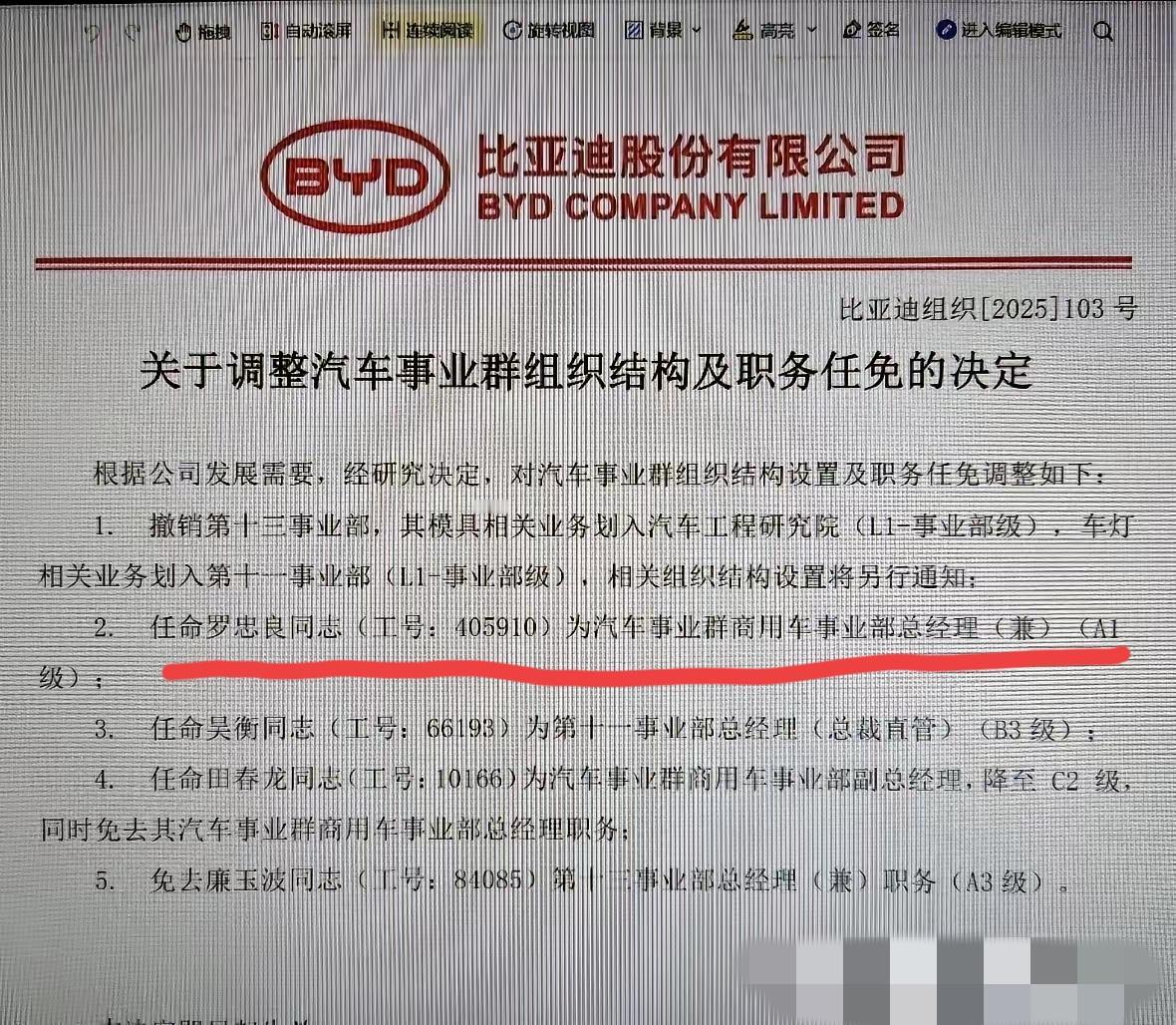 在比亚迪公司有一个叫罗忠良的管理人员,他在2008年时还只是一个负责一条生产线的小厂长,不值一提。然后时间来到了2025年,也就是十七年后的今天,罗忠良没有跳槽,选择在比亚迪干一辈子。现在厉害了,他的能力得到了老板王传福的器重,现在已经是身兼多个事业部的总经理和总裁了。要知道,这可不是一家小公司,而是一家集团公司,能在职场上升到这个位置,可以说是凤毛麟角。而能从八十多万员工中脱颖而出,做到管理A级,年薪加分红加股权已经有上亿身价了。 这说明什么呢?说明前几天王传福在演讲时说到,公司里他直管的一半总经理都是从应届大学生中提拔的,这句话是真的。 王传福说,近三年就已经招聘了5万名应届大学生,这5万名大学生中有70%都是硕士和博士。 我觉得在一家重视人才的公司工作,人生才有价值,职场发展才能更有前景。而王传福的公司显然是做到了。