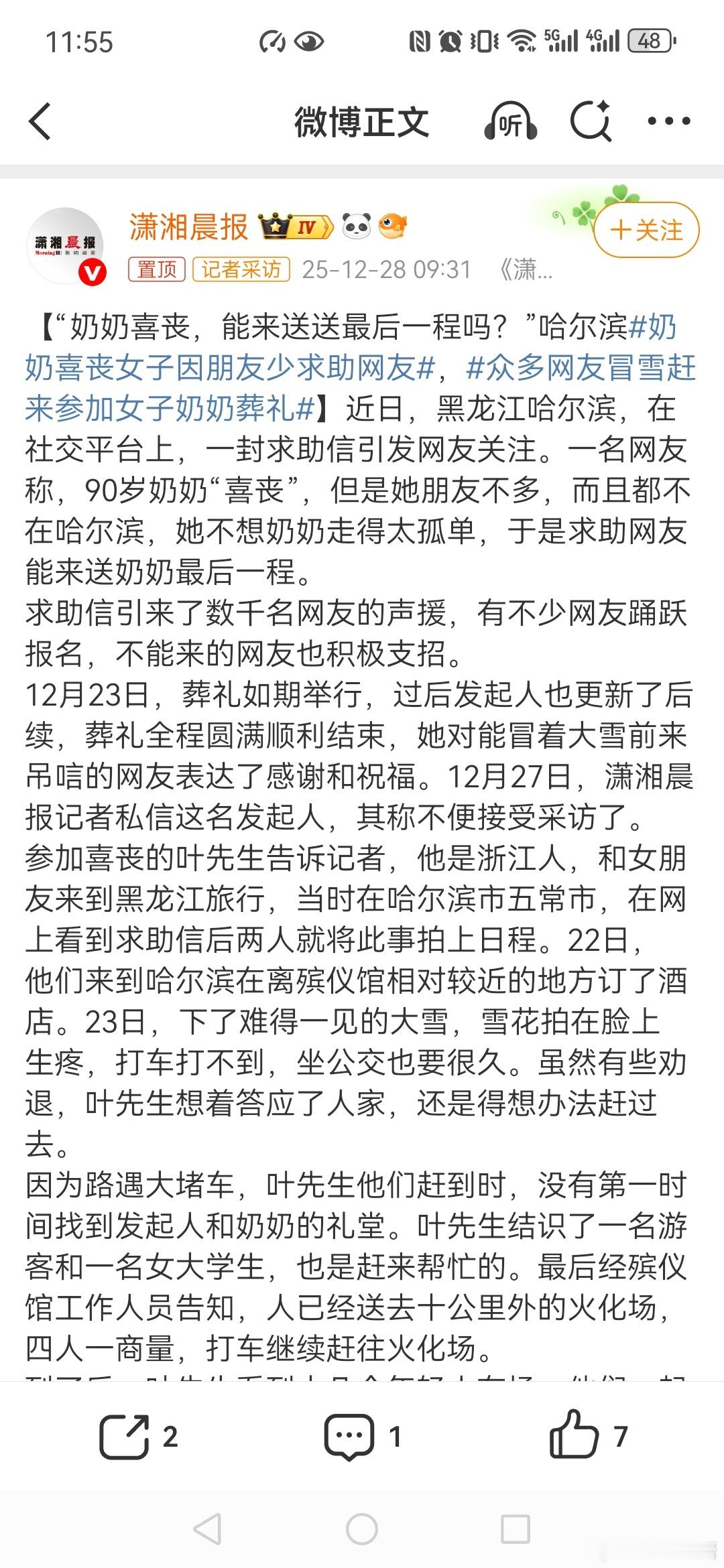 ”哈尔滨奶奶喜丧女子因朋友少求助网友,众多网友冒雪赶来参加女子奶奶葬礼现在的独生子女太难了!没有兄弟姐妹,父母老了或者不在了,或者只有奶奶爷爷带大的,老人也过逝,他或她一个人承受孤苦伶仃,没有人商量,没有人帮衬,真的是好孤独!看了视频,心里有一种悲哀! 这事儿看得人心里暖烘烘的!天寒地冻,那么多陌生人顶风冒雪赶来了。这不光是一份送别,更是人间真情的见证。网络时代,一句求助就能聚起人心,让冰冷的冬天有了温度。 去现场送奶奶的好心人都是优秀的中国人,心中都是有大爱的,愿到场的小辈们健康健康,万事如意,心想事成,一生无忧。 不过如果是我,我觉得我不会求助,简简单单的办个丧事,不通知任何人,因为越简单越好,只要活着尽孝就可以了,其他的都是面子,也不内耗自己。