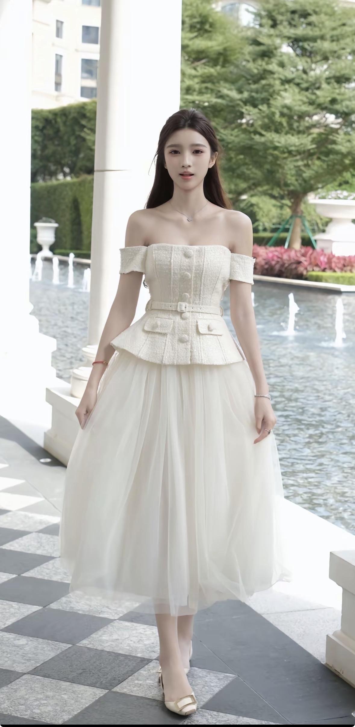 优雅白色连衣裙,漫步在豪华酒店花园中,感受浪漫与宁静。