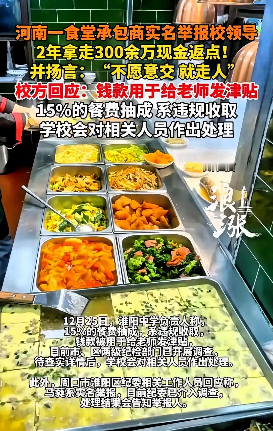 “必须抓起来!”河南一女子承包学校食堂,学生每天20元餐费,原以为有可以赚钱 起初校方约定收取4.5%的管理费,双方达成共识,这本是合理的合作范畴。可校方却单方面调整规则,直接将管理费涨至15%,短短两年时间,就从学生餐费里抽走330多万的返点,这一行为,让合规经营的承包人难以承受,也让大众看到了其中的问题所在。 面对举报,校方对抽成的事实并未否认,只是表示这笔钱用于发放教师津贴。但大家都清楚,学生的伙食费有明确规定,必须专款专用,全部投入到学生的饮食供应上,这是不容变通的原则。教师的津贴福利,有专属的财政保障渠道,绝不能用学生的口粮钱来填补,这样的说法,显然站不住脚,也违背了基本的管理准则。 其实这类现象,在不少地方都或多或少存在,只是很少被摆到明面上来。校园食堂本是服务学生的配套设施,不是谋利的渠道,可现实里,食堂承包往往成了所谓的“肥差”,要么被内部关系把控,要么对外承包就层层抽成,最后受累的是经营者,吃亏的还是在校就餐的学生。 教书育人的校园,最该守住底线和初心。学生的一餐一饭关乎成长,家长愿意把孩子送到学校,也是出于一份信任。食堂的每一分餐费,都该花在孩子的饮食上,保障菜品质量和分量,这是最基本的责任。 此次相关部门已经介入核查,希望能查清事实真相,理清钱款去向,给所有人一个公正的结果。也希望能借此规范校园食堂的管理,守住学生餐费的底线,让食堂回归服务本质。校园的初心是育人,任何时候都不该让利益算计,冲淡了这份本心。