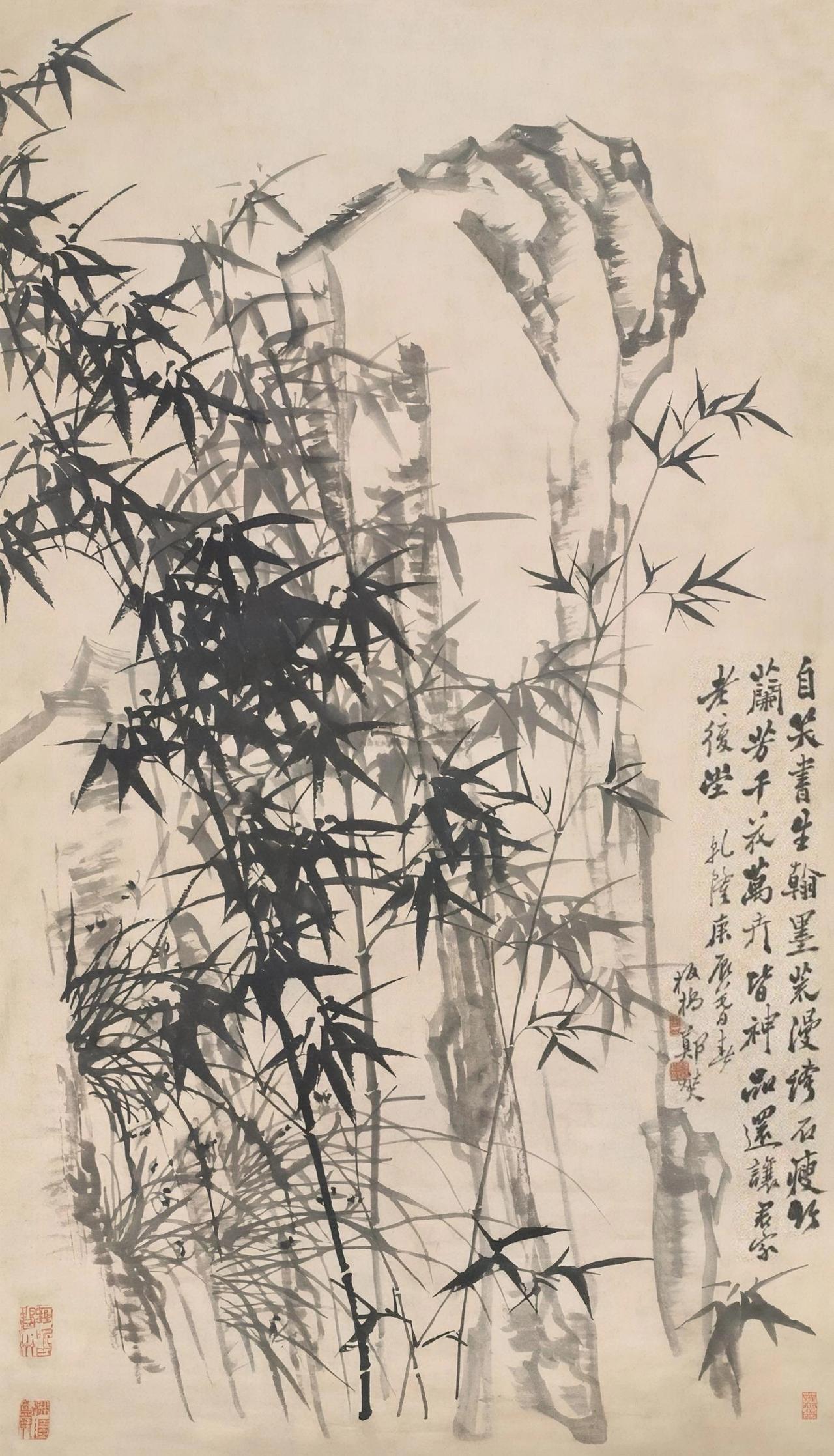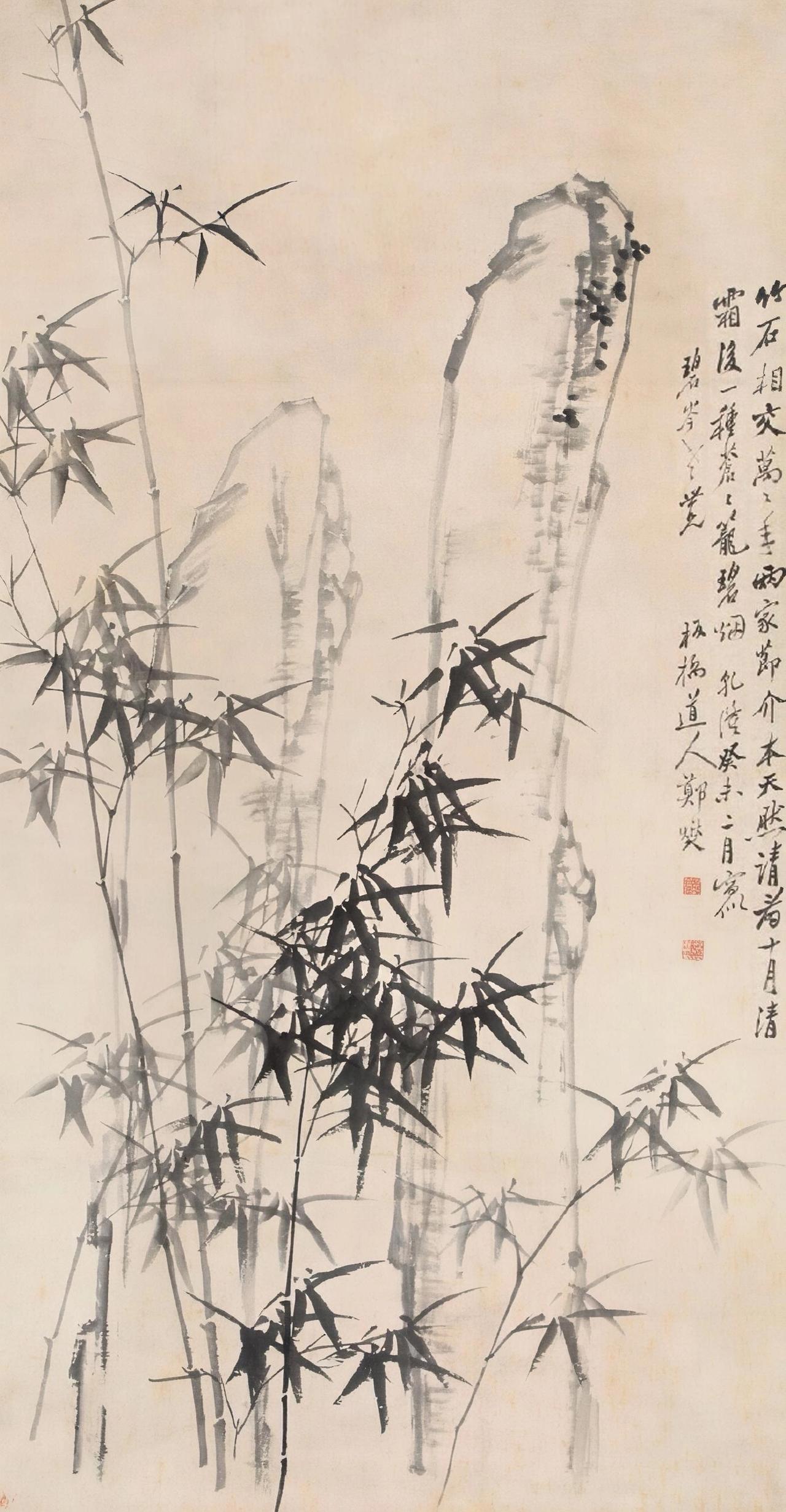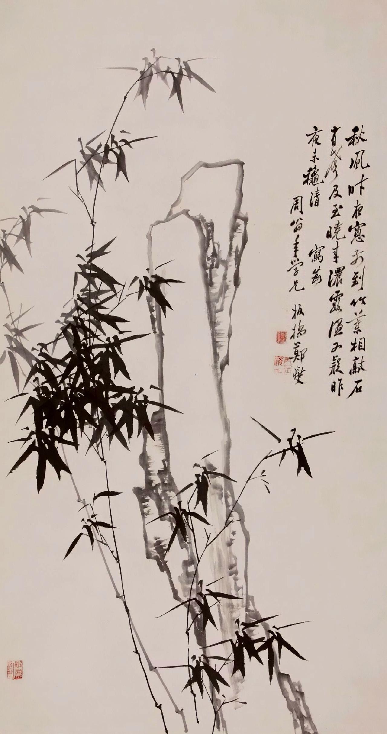 郑板桥的竹画,那可是一绝!他是“扬州八怪”代表,诗书画堪称“三绝”。一生只画兰、竹、石,竹画更是他的招牌。 他画竹实为“画人”,是人格投射与民本情怀的体现。竹叶常以“之”“女”“介”字形组织,画竿中侧锋并用,圆劲挺直;画节、枝中锋为主,挥洒迅疾;画叶如楷书撇捺。多以水墨为主,浓淡干湿表现竹叶远近向背,常浓墨写叶,淡墨写枝,焦墨点节,竹竿留“飞白”体现粗糙质感。 他还独创“六分半书”题诗于竹石间。他早年追求“胸有成竹”,却称胸中之竹非眼中之竹,手中之竹非胸中之竹,强调对自然的观察,他还曾在院落种竹日夜揣摩。 郑板桥 名画 郑板桥诗竹石 郑板桥书法对联 郑板桥词 郑板桥书法扇面 竹子书画 梅兰竹菊水墨画 郑板桥装饰字画