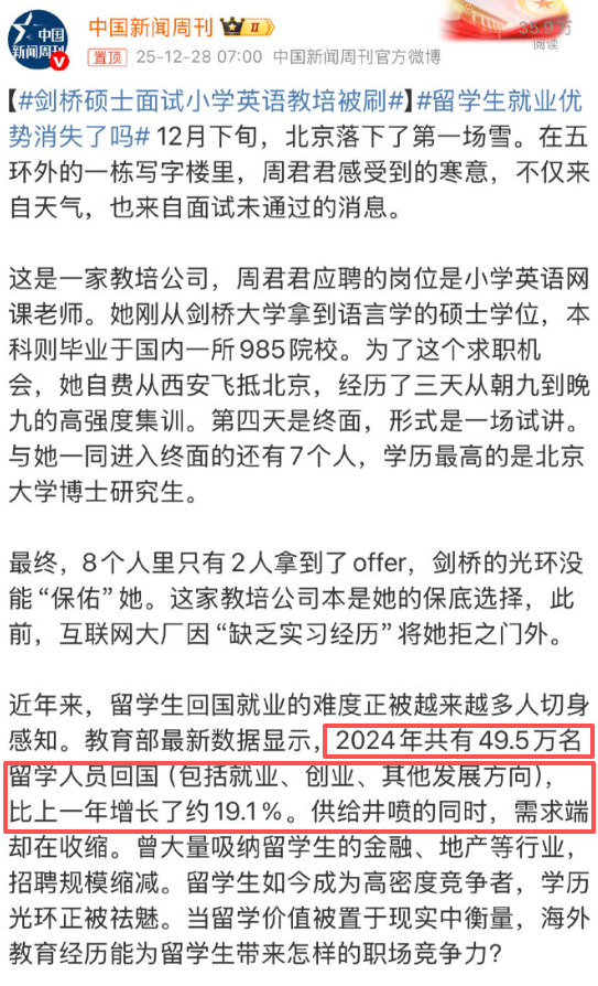 剑桥硕士面试小学英语教培被刷高学历对于个体的溢价越来越低,是不可逆的大趋势。别说文科了,就是理工科,像华为比亚迪在10年前就是985拿来保底的,人均点击就送的offer,但今天却要好几轮激烈的笔试面试才能抢到。现在的行情,AI半导体等少数热门理工专业+顶级学校还能撑住,弱势理工科和传统文科就堪忧了。新闻里主角本科是985,硕士在英国剑桥语言学,我念书时还真去剑桥做过交换生,硕士语言学这些年在HR心理的含金量如何,留子们应该都懂。剑桥的语言学也是语言学。国内从上到下对海外学历的祛媚过程还在加速,而且名企们都在降本增效,能开出高薪的大厂大公司,招1个人恨不得当2个人用,连国内清北以外的学历都不一定买账招来当门面了,更别提海外的所谓名校。2024年49.5万留学生回国,同比增长19%,2025年只会更多,但优质工作的headcount肯定不会上升,僧多粥少的现实只能是妥协降级。不过好在去海外读一两年文科商科硕的,都是自费每年至少三五十万的学费生活费,家里基本大中产以上也能兜底,是脱产考公考编的主力军。留学生就业优势消失了吗