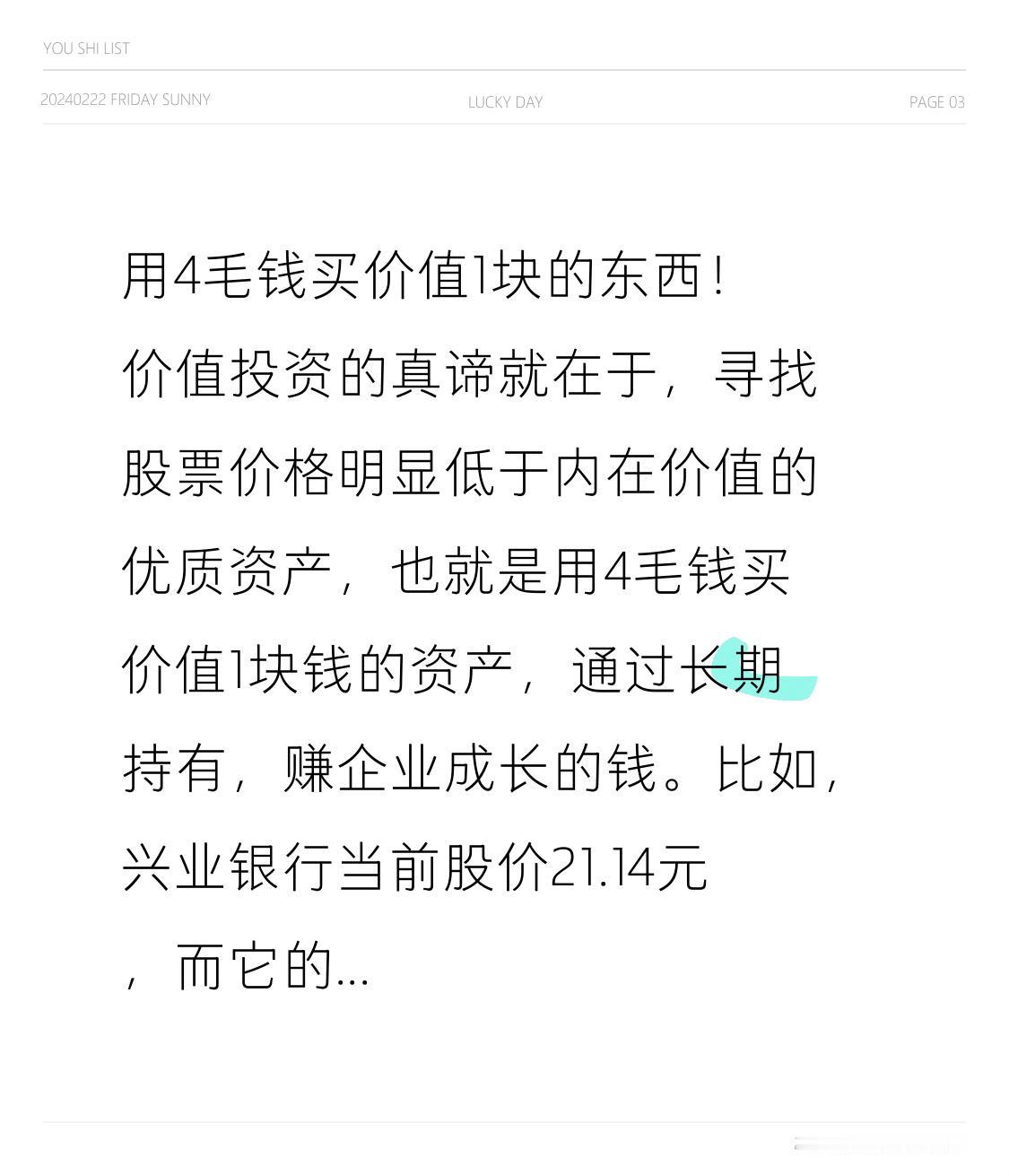 用4毛钱买价值1块的东西! 价值投资的真谛就在于,寻找股票价格明显低于内在价值的优质资产,也就是用4毛钱买价值1块钱的资产,通过长期持有,赚企业成长的钱。 比如,兴业银行当前股价21.14元,而它的每股净资产是38.31元,市净率0.55。也就是说,当前买入就是用5毛5买价值1块钱的东西。 买股票为啥说要有耐心呢?就是用极致的耐心去等一个相对低的价格。买入被套的,大概率是追涨的。