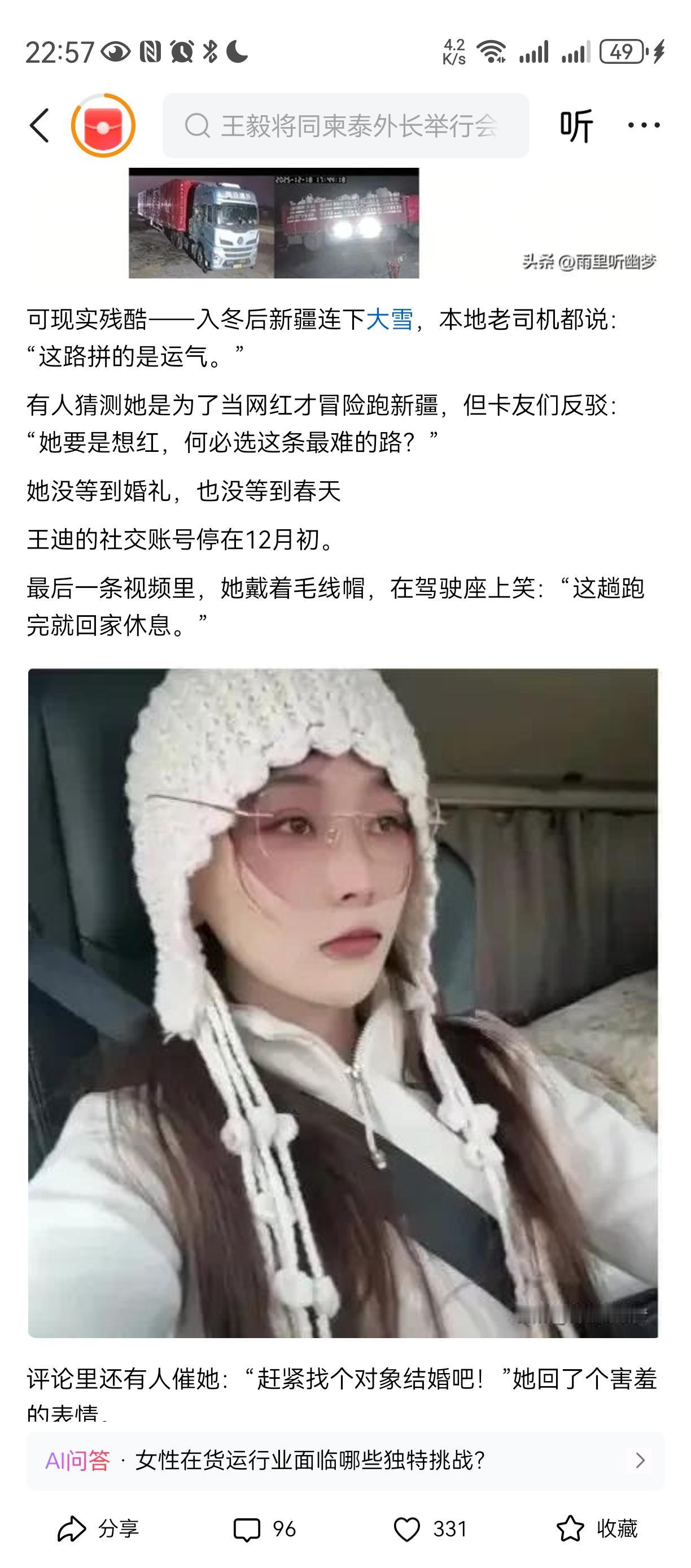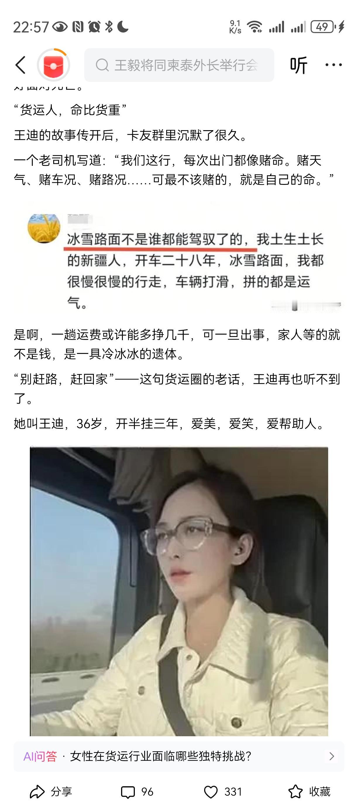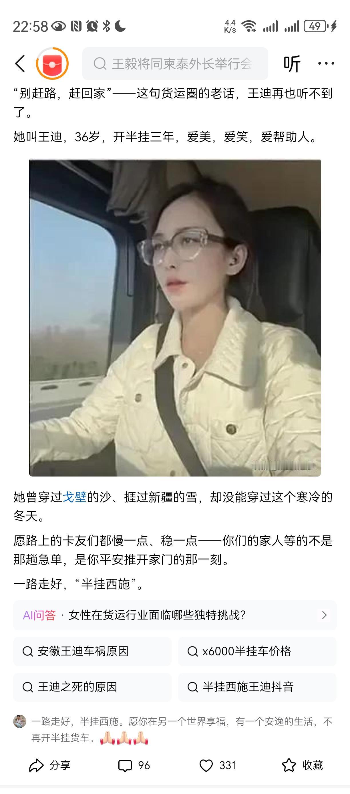 红颜薄命[祈祷][祈祷][祈祷] 一个大美女, 开个大挂车, 走南又闯北。 个中的艰辛, 冷暖你自知。 可惜天不酬勤, 突发世故殒命[祈祷][祈祷][祈祷]货车上的女人 很佩服也很疼心[祈祷] 安息[祈祷][祈祷][祈祷]