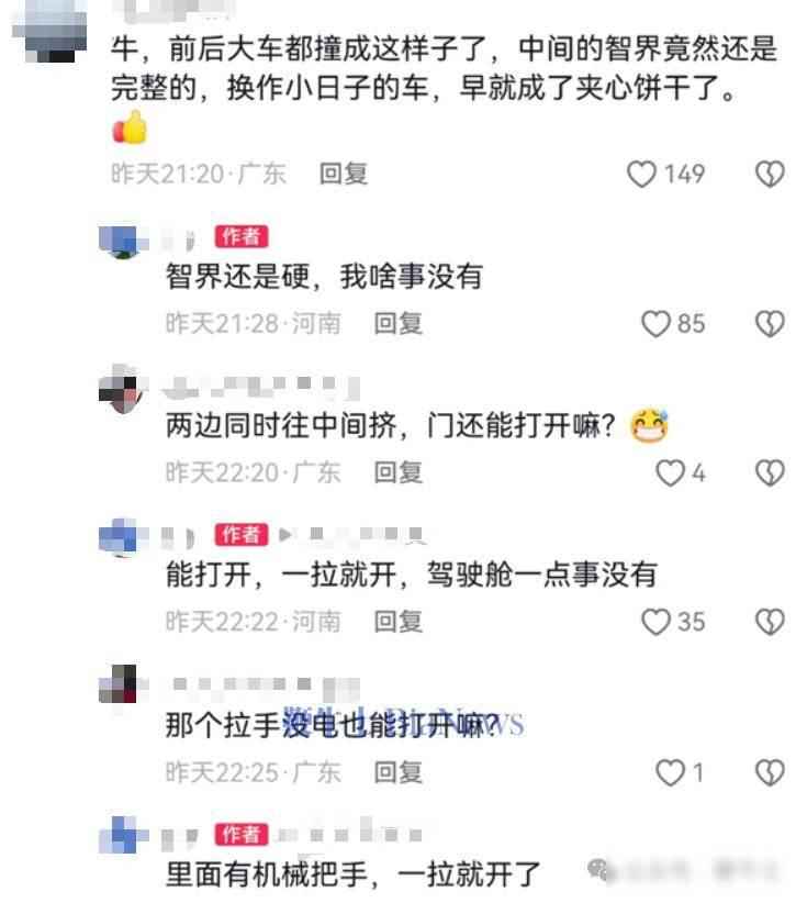 命大!车被挤压成废铁,车主奇迹生还,这车质量绝了! 前两天在高速上发生一件怪事,一辆智界S7被两辆大货车夹在中间,前面是厢式货车,后面是重型牵引车,两边一起撞过来,车子几乎变形到报废状态,但车主自己打开车门走了出来,身上连一点擦伤都没有,他拍了视频发到网上说“我什么事也没有”,评论区一下子全都炸开了。 有人问这车门怎么还能打开,车身都撞得皱巴巴了,车主后来解释说驾驶舱没有变形,门框也没卡住,他一拉就打开了,这事儿确实少见,一般这种撞法车门早就该卡死在车身上动不了,但智界S7的车门没出问题,连安全气囊的位置也爆得准,这说明它的车身骨架设计真起了作用。 这辆智界S7的起步价格是22.98万元,它采用华为的800V高压平台,续航能力最高可以达到855公里,车主试驾之后立即订购了新款R7,表明他对品牌非常信赖,R7性能更强,双电机版本零百加速只需3.9秒,充电15分钟就能从30%充到80%,增程版综合续航更是超过1600公里,搭载的是华为雪鸮系统。 这次事故跟自动驾驶没关系,完全是司机自己开车时被外部撞击导致的,电池也没有冒烟或起火,说明高压系统和热管理做得比较稳定,有网友拿它和某个品牌的Model Y对比,那款车以前出现过A柱断裂,导致乘客受伤,智界这次算是用实际经历换来了口碑,虽然没人希望再发生类似事件。 在高速上大货车很多,盲区很大、刹车很慢,追尾事故经常发生,这次车主没有怪车不好,反而觉得这车安全可靠,网上开始有人刷“硬核安全”“车比人靠谱”这样的标签,官方没有出来说话,全是网友自己在传播,这种真实的事故比任何碰撞测试都更直观,也更让人相信。 我倒是觉得,车企宣传安全的时候不能只看实验室的数据,真正遇到极端情况时,能不能让人活下来才是最关键的,智界这次算是运气好,也是设计做得比较到位,不过这种事还是越少越好,毕竟谁也不想当测试样本。
